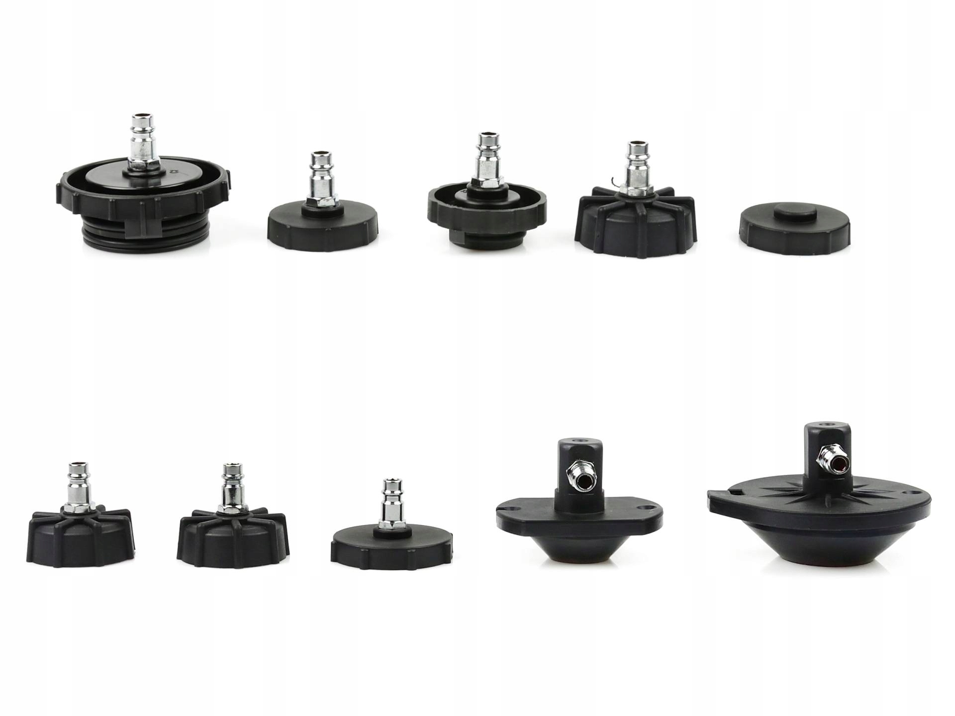 В наборе 8 шт. переходники бачка тормозной жидкости, 3 шт. универсальные переходники, емкость для отработанной тормозной жидкости с тросом и резиновым переходником.