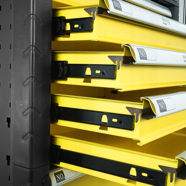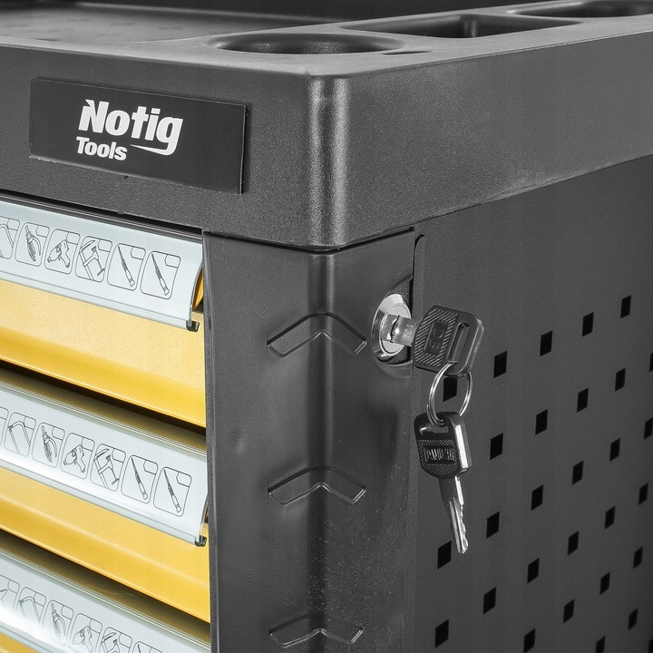 Шкаф для инструментов Notig Tools имеет7 практичных ящиков для инструментов, закрывающихся на центральный замок. Все ящики полностью открываются и имеют металлические шариковые направляющие, что обеспечивает длительную, плавную и надежную работу. Ящики фиксируются замком-защелкой, который обеспечивает защиту окружающей среды во время транспортировки. Поверхность столешницы устойчива к маслам и жирам. Пятидюймовые бесшумные поворотные колеса облегчают маневрирование шкафа и оснащены тормозом. Шкаф оснащен ручкой, облегчающей его переноску. Это позволяет поддерживать порядок на рабочем месте. Благодаря ящикам, закрывающимся на ключ, инструменты защищаются от кражи.