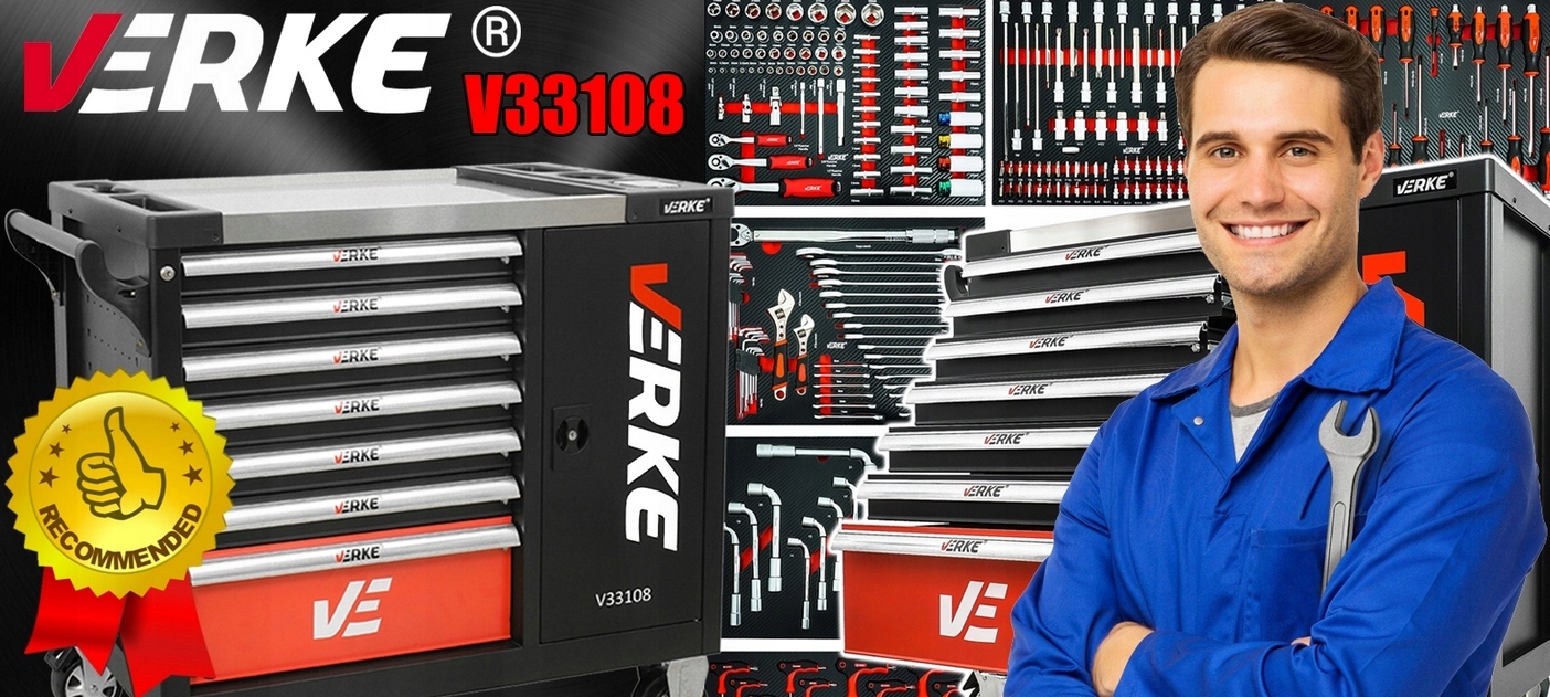 Шкаф для инструментов Verke имеет 7 практичных ящиков для инструментов, закрывающихся на центральный замок. Все ящики полностью открываются и оснащены шариковыми направляющими, что обеспечивает длительную, плавную и надежную работу. Ящики фиксируются замком-защелкой, который обеспечивает защиту окружающей среды во время транспортировки. Поверхность столешницы устойчива к маслам и жирам. Пятидюймовые, бесшумные, поворотные колеса облегчают маневрирование шкафа и оснащены тормозом. Шкаф оснащен ручкой, облегчающей переноску.