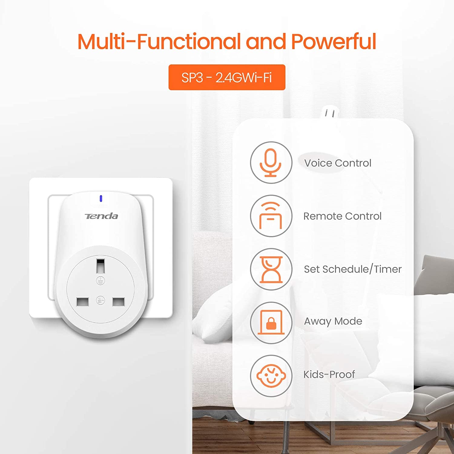 Работа на Wi-Fi 2,4 ГГц (5 ГГц не поддерживается), для подключения не нужно покупать дополнительный концентратор. Он имеет изящный дизайн и подходит к стандартной розетке Великобритании, не блокируя вторую розетку.