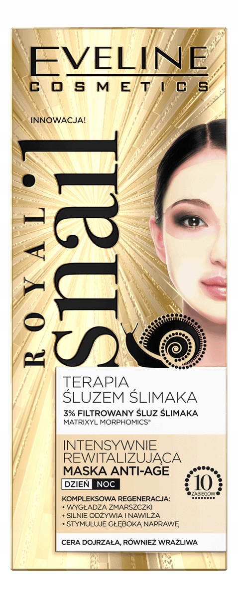 Королевская линия улитки содержит концентрированную активно сглаживание 30+, концентрированные интенсивно против wwrinke 40+ крем, концентрированные сильные крема 50+, концентрированные ультрапараллельные крема 60+, концентрированные кремовые кремы активно регенерации 70+, концентрированные кремы BB и на веках 30/40 интенсивно поднимая 50/70, маянг -крем BB. Eveline Royal Snail Интенсивно оживляя антивозрастную маску предназначена для комплексного ухода за зрелой кожей. Синергетическая комбинация фильтрованной слизистой улитки и последнего поколения Matrixil Morphomix® действует как нерелюбированное наполнитель из морщин. Это заметно увеличивает твердость и плотность кожи, даже заполняя фиксированные морщины. Драгоценное масло авокадо, усиленное Blue Collagen ™, предотвращает сухость и восстанавливает гладкость. Инновационный геппептид PEP-7Repair ™ увеличивает скорость обновления клеток, укрепления и восстановления эпидермальных структур.