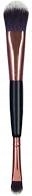 Двойная кисть для макияжа для лица. Изготовлен из двухцветной синтетической, мягкой и недеформируемой щетины. С одной стороны имеется длинная приплюснутая кисть с язычком, идеально подходящая для нанесения тонального крема. С другой стороны находится меньшая по размеру приплюснутая кисть в форме язычка, которую можно использовать для точечного нанесения консилера. Вместе они создают незаменимый дуэт при нанесении повседневного макияжа. Черный матовый стержень и наконечник из розового золота идеально сочетаются друг с другом.