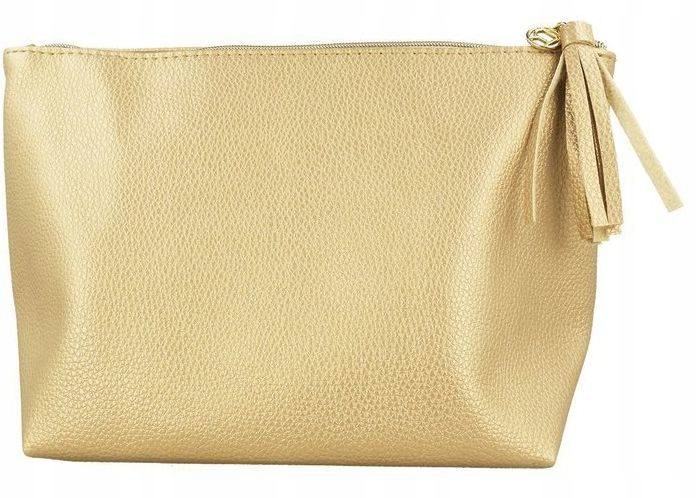 Большая косметичка с одним карманом, закрывающаяся на молнию золотистого цвета.