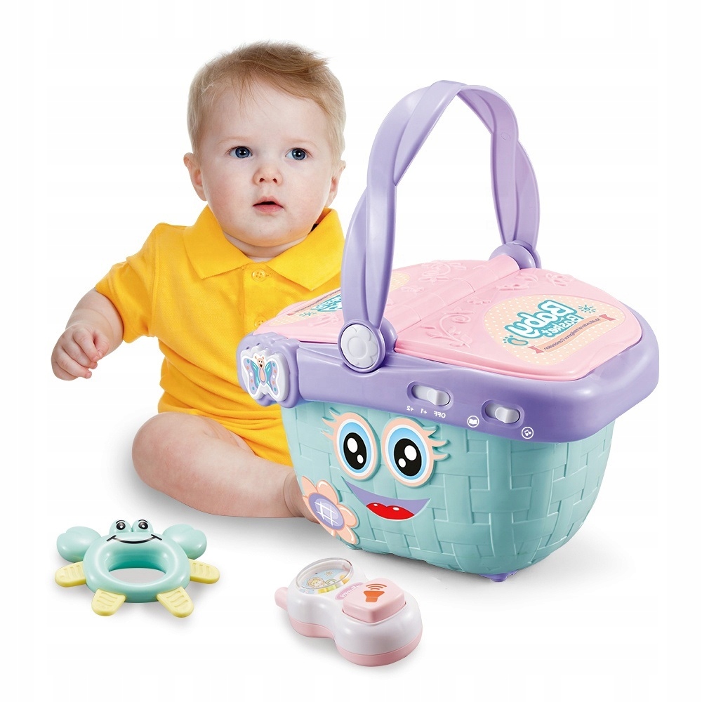 Интерактивная корзинка для пикника — это интерактивный набор, в который входит очаровательная сине-розовая корзинка для пикника с улыбающимся лицом, фиолетовая подвижная ручка для переноски и 3 погремушки-прорезывателя.