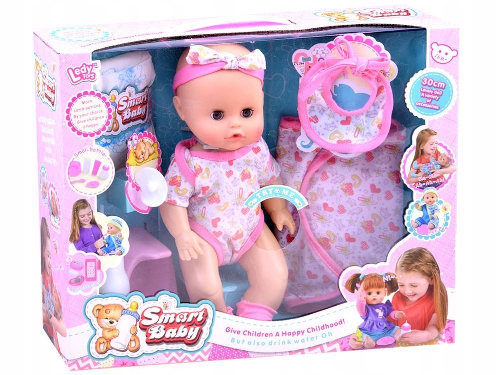 У куклы также есть функция поения, поэтому она тоже может писать. Кукла одета в боди, повязку на голову и носки. Во время кормления ее можно завернуть в одеяло и надеть нагрудник. В комплектацию также входят подгузник и горшок для куклы.