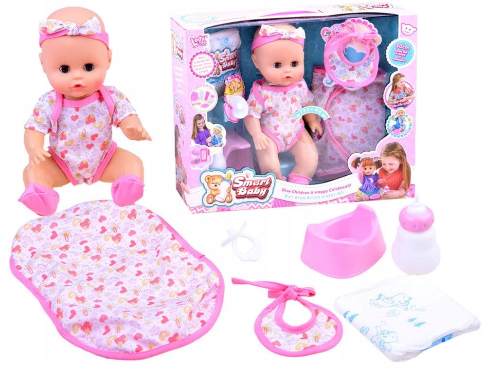 Кукла одета в боди, повязку на голову и носки. Во время кормления ее можно завернуть в одеяло и надеть нагрудник. В комплектацию также входит подгузник и горшок для куклы.