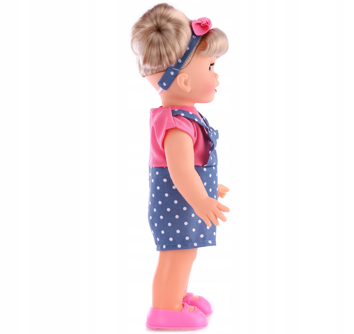 Кукла одета в синий комбинезон в белый горошек, розовую блузку, удобные туфли и красивый бантик в волосах.