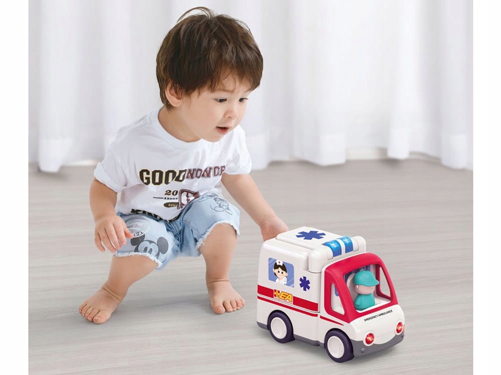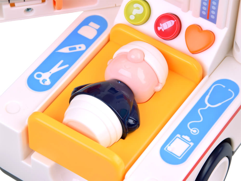 Интерактивная машина скорой помощи оснащена спасательным оборудованием. Игрушка может двигаться самостоятельно, меняя направление при встрече с препятствием. Во время движения автомобиля издаются звуки запуска двигателя, сирены скорой помощи, гудка, горят фары, играет веселая музыка, слышен звук торможения. Под шасси находится переключатель, позволяющий включать и отключать функцию самостоятельного вождения.