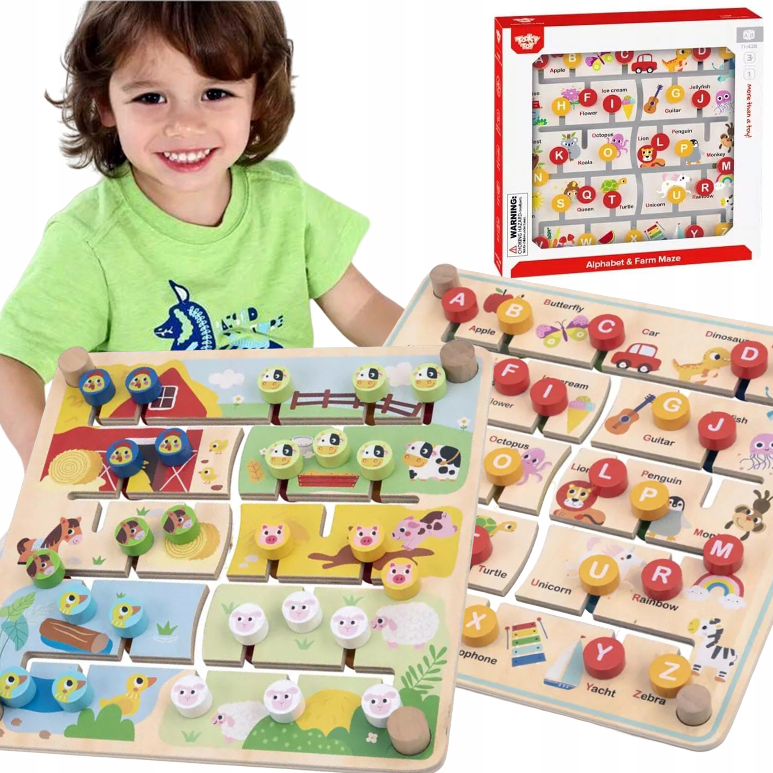 Интерактивная двусторонняя деревянная доска от бренда TOOKY TOY – это инновационная и развивающая игрушка. На одной стороне доски находится красочная головоломка с фермой, в которой дети должны сортировать животных и распределять их по соответствующим загонам и конюшням. На второй странице представлена увлекательная игра с алфавитом, в которой дети учатся расставлять буквы от А до Я. Игрушка способствует развитию навыков решения проблем, распознавания форм, цветов и изучения букв.