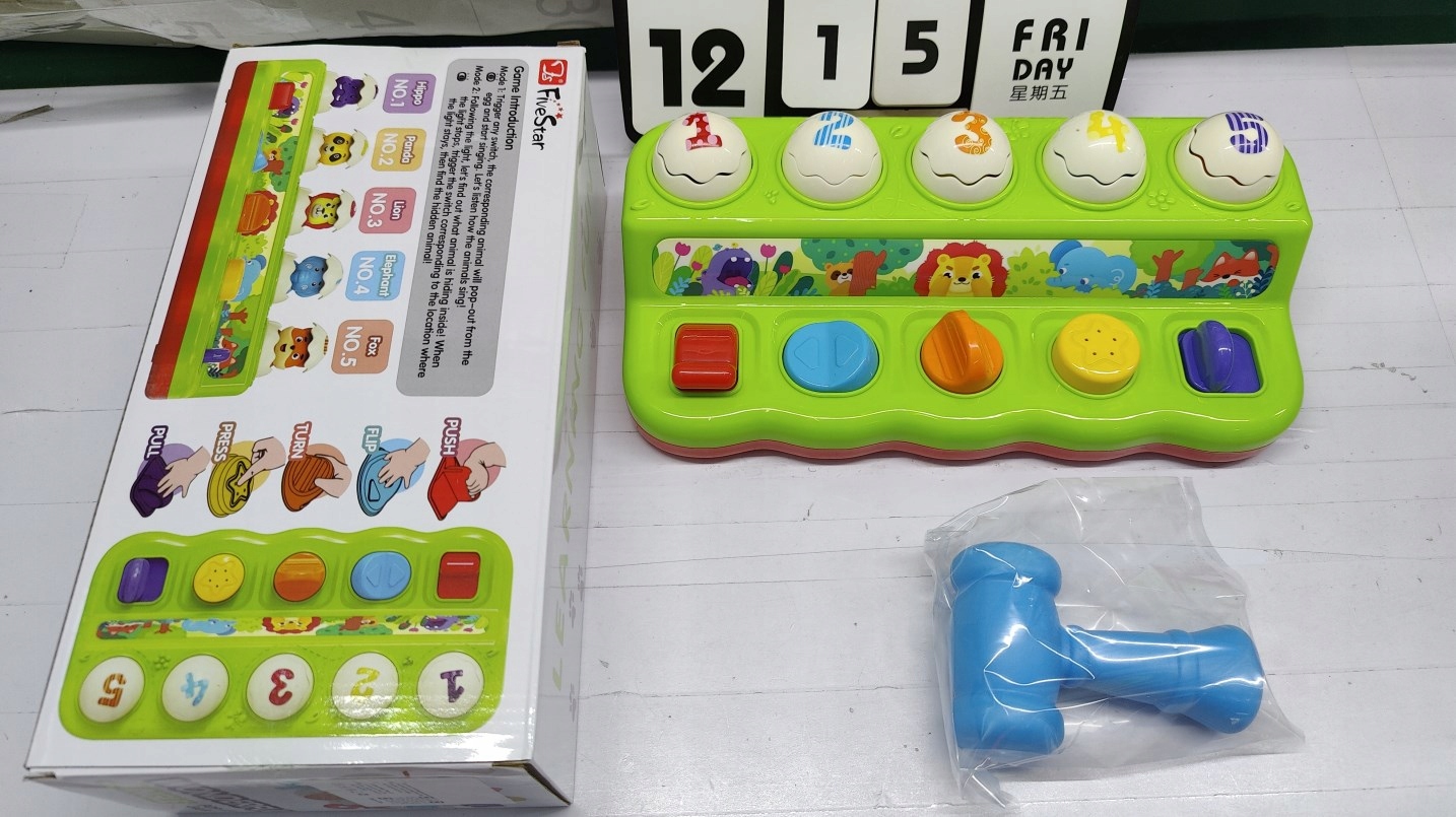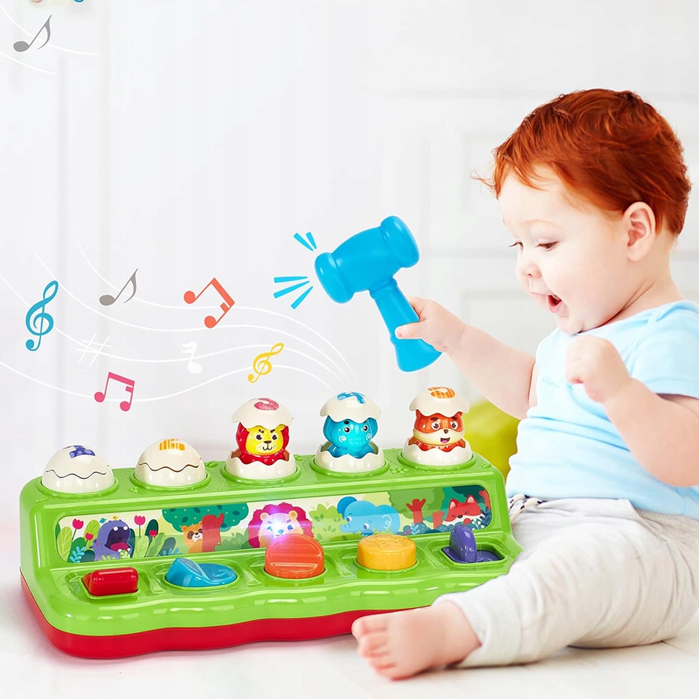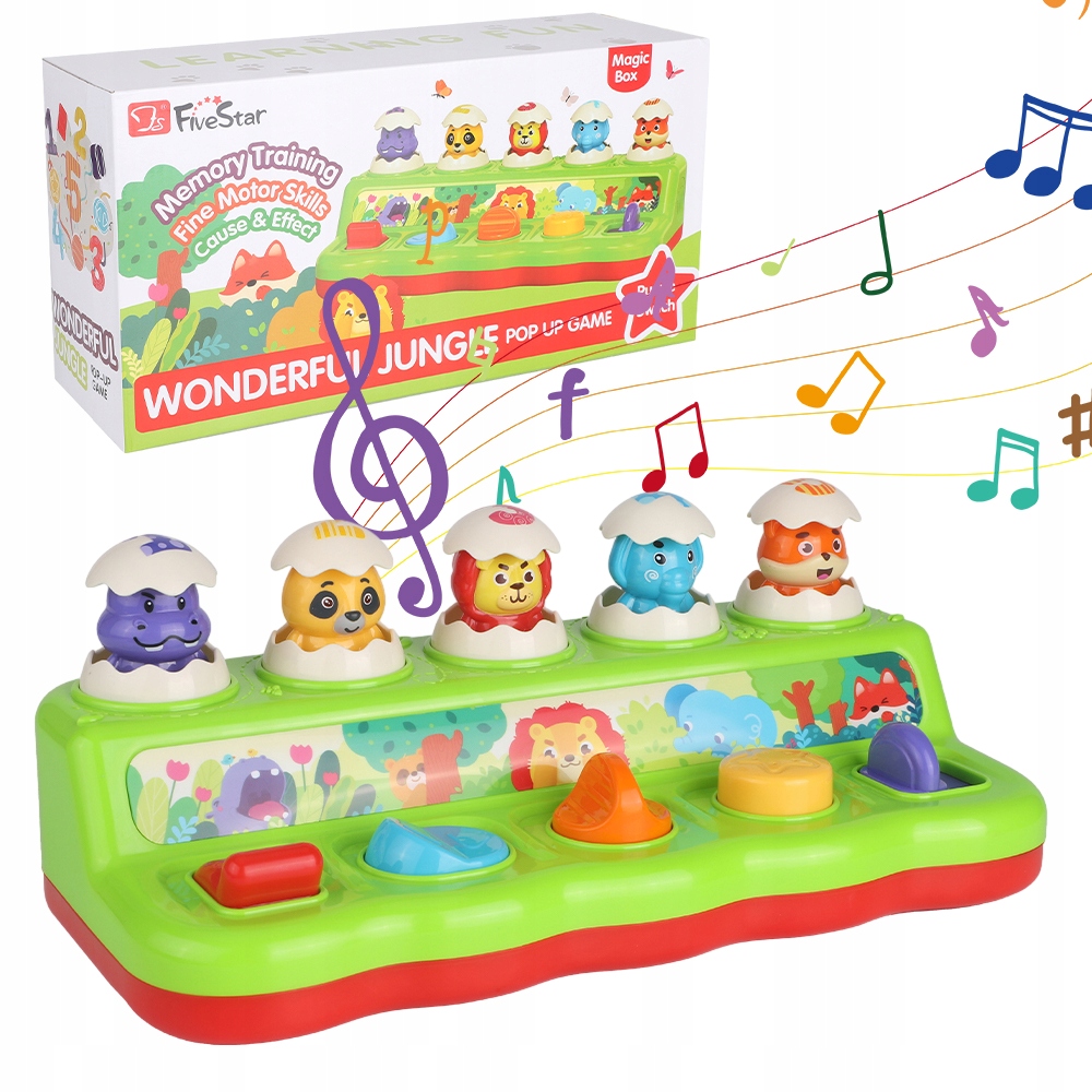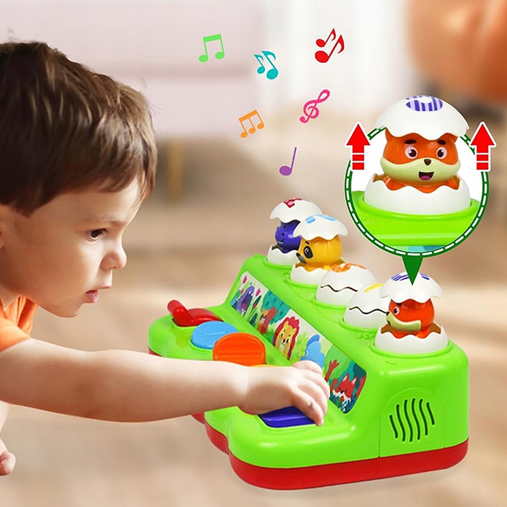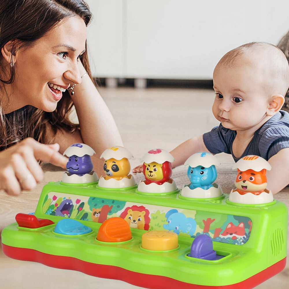 Когда ваш малыш толкает, поворачивает, крутит, нажимает и тянет разноцветные кнопки, милый бегемот, енот, лев, слон и лиса вылезают из яиц под приятную музыку и веселые звуки животных.