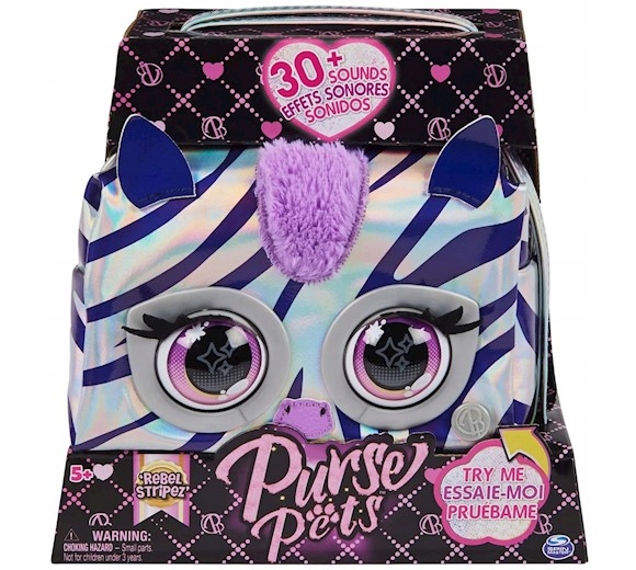 Игрушечная сумочка Purse Pets Rebel Stripez создана как очаровательный аксессуар для девочек. Эта маленькая симпатичная сумка, выполненная в фиолетовых и голографических полосах, напоминает принт зебры. Ее уникальность подчеркивают большие фиолетовые глаза с длинными ресницами и короткие уши. После нажатия на кнопку, расположенную в правом нижнем углу сумки, игрушка издает различные приятные звуки, а также открывает и закрывает глазки. Это не только обычная сумочка, но и друг, который будет сопровождать вас во время прогулок, покупок или встреч с друзьями.