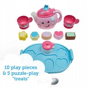 Мизиночки вверх! С чайным сервизом «Смейся и учись сладким манерам» и волшебным светящимся чайником все становится очень мило. Когда вы наклоняете кастрюлю, чтобы налить чай, носик загорается и воспроизводит веселые песни, звуки и многое другое! Нажмите кнопку с чайным пакетиком, чтобы услышать еще больше веселых песен и огней! Этот очаровательный чайный сервиз с двумя чашками чая, сахарницей и подносом с прохладными «угощениями» идеально подходит для того, чтобы поделиться с другом и преподнести ваш маленький ужин с хорошими манерами. Кроме того, в чайный набор входят три уровня Smart Stages с разными песнями, звуками и фразами, поэтому удовольствие от обучения может расширяться по мере роста вашего ребенка!
