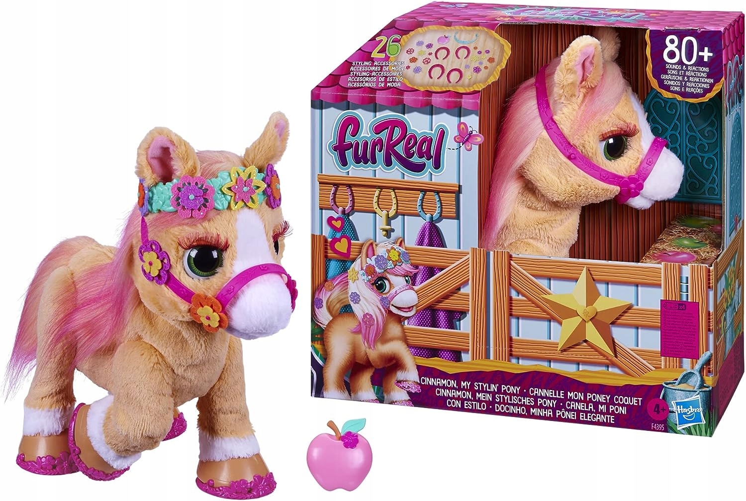 Ухаживать и укладывать эту бисквитную пони с зелеными глазами — это очень весело. Благодаря 26 гаджетам, среди которых украшенные подковы, цветочная корона и украшения для уздечки, Цинамонка в мгновение ока превращается в настоящую красавицу. А аксессуар из яблока может быть и лакомством, и щеткой для вашего питомца.