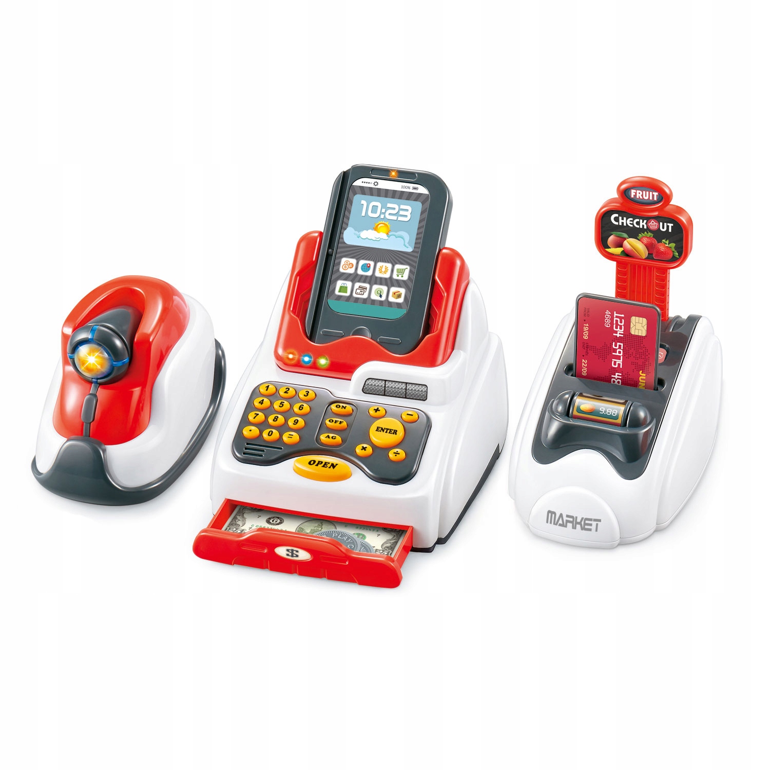 может быть оплачен наличными или картой . Кассовый аппарат имеет выдвижной ящик за деньги - открытие с одной кнопкой. Сканер также прилагается к кассовым аппарату. ребенок может чувствовать себя настоящим продавцом и сканировать продукты. Просто прикоснитесь к продукту к глазу сканера, и это зажечь и издает звук поставки продукта.