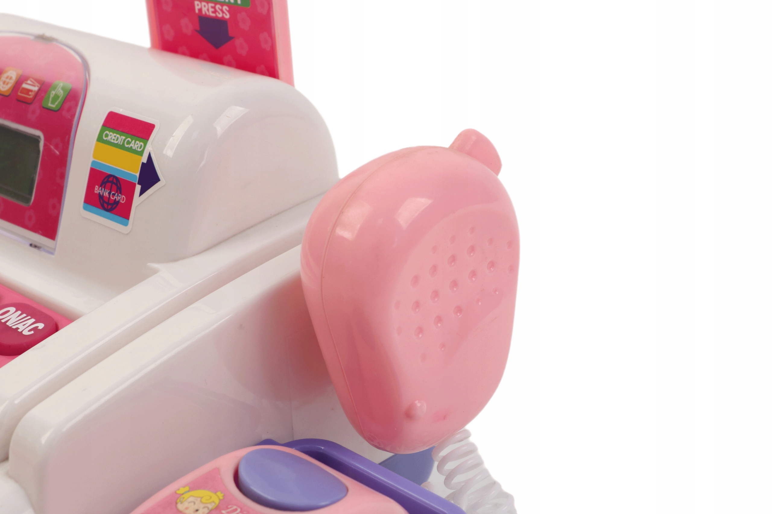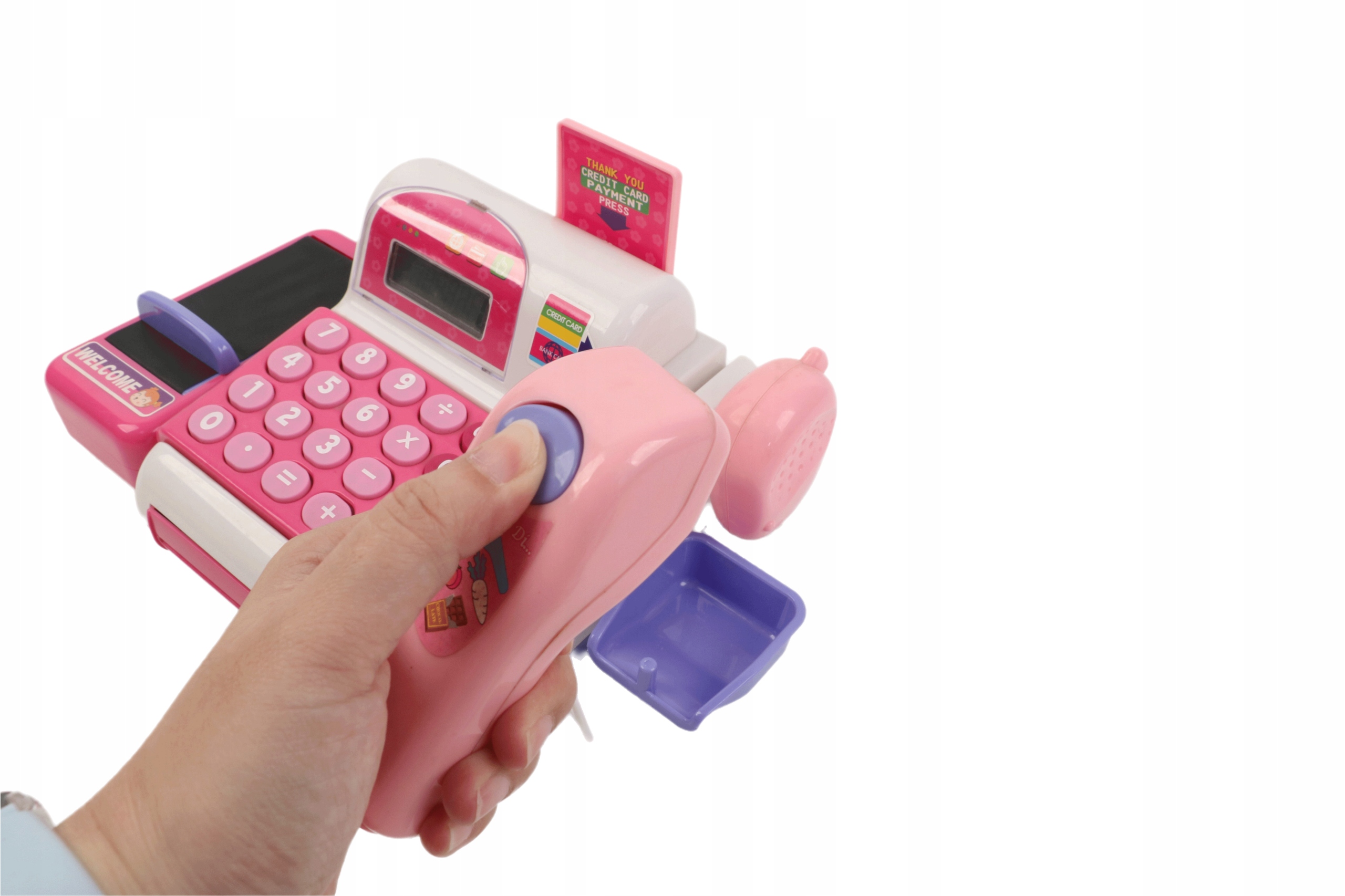 - Реалистичные элементы: кассовый аппарат с калькулятором, кард-ридер, микрофон, корзина для покупок, продукты и игрушечные деньги.