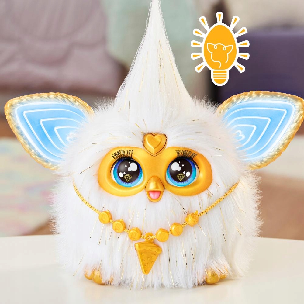 Hasbro FURBY 2.0 GOLD GLOW — интерактивный талисман, который не только выглядит как звезда сцены, но и ведет себя как настоящий товарищ по играм. Он реагирует на ваш голос и прикосновения, как настоящий питомец!