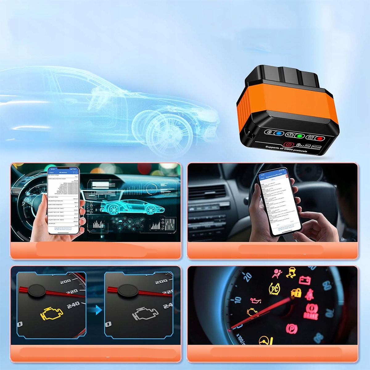 - Прибор для диагностики автомобилей поддерживает более 100 марок автомобилей и 100 000 моделей, включая большинство автомобилей, произведенных в США с 1996 года, или все автомобили, произведенные в Европе с 2001 года, с протоколом OBDII, автомобили с интерфейсом OBD2 и автомобильным аккумулятором 12 В. Приложение также поддерживает 15 языков, поэтому вы можете обойти языковой барьер.