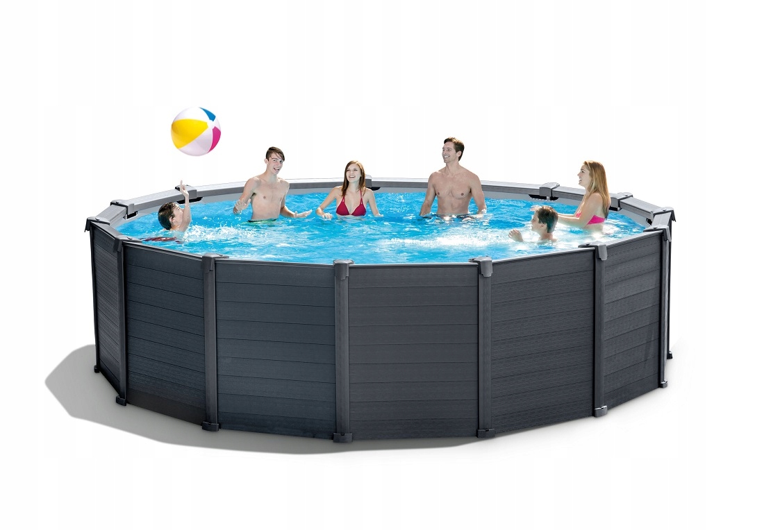 В круглом панельном бассейне может разместиться действительно большая семья. Значительная глубина бассейна позволяет свободно плавать, но при этом обеспечивает безопасность маленьких детей. Материал, из которого изготовлен бассейн, состоит из 3 слоев. Два внешних слоя представляют собой прочный винил дополнительной толщины. Между слоями установлена армирующая нейлоновая сетка. Все покрытие устойчиво к проколам. Внутренняя часть бассейна покрыта графикой, имитирующей сине-белую мозаику. Устойчивость бассейна обеспечивается очень прочным панельным каркасом, который легко раскладывается. Дополнительно в комплект входит чехол, защищающий воду от грязи, коврик, защищающий дно от повреждений, и лестница.