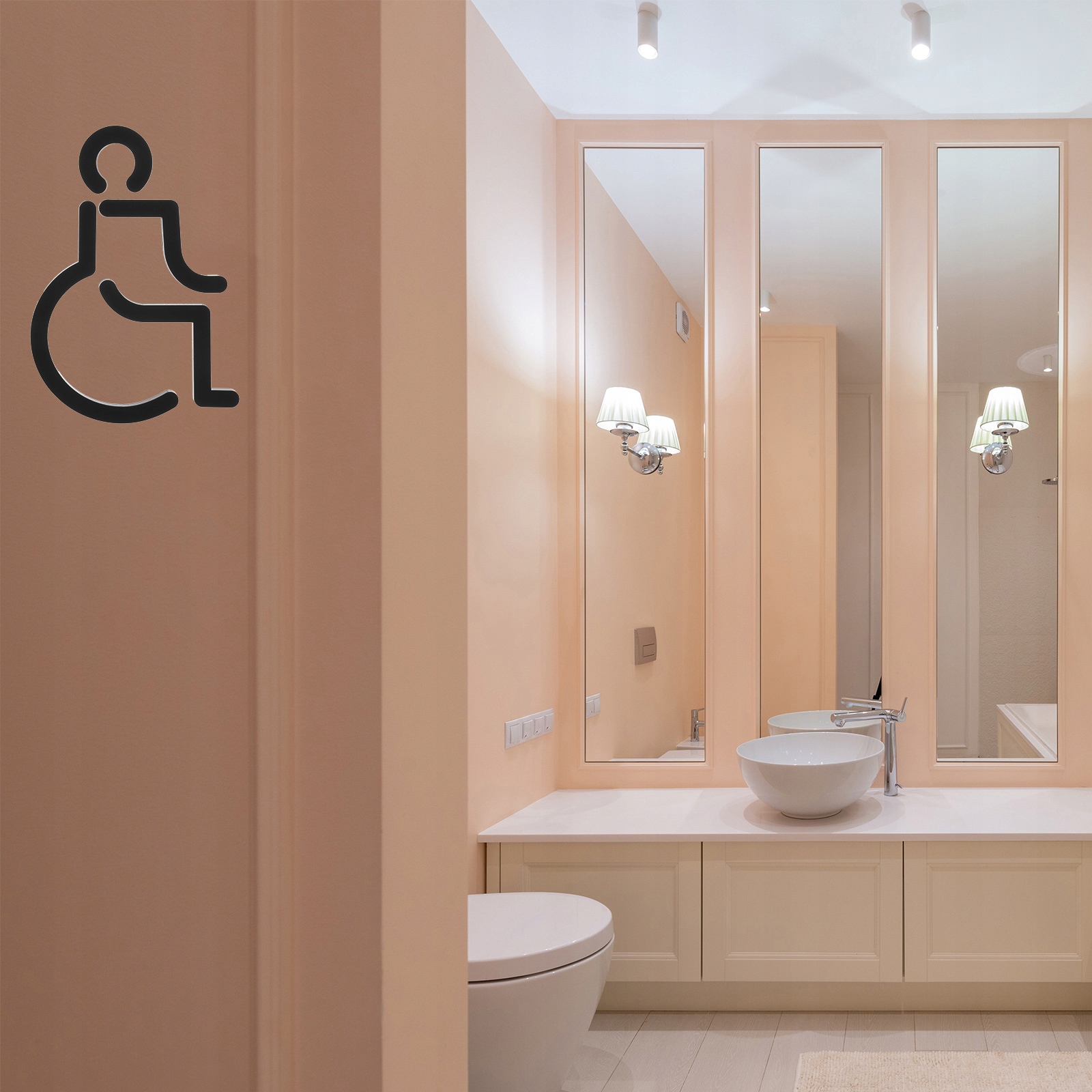 Символ инвалидной коляски для людей с ограниченными возможностями уместен и идеален на дверях общественных туалетов, туалетов и лифтов.