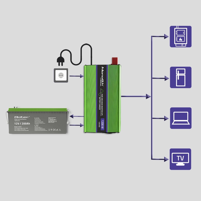 Преобразователь марки Qoltec имеет чистый синус, он выдает такой же ток, как и в розетке 230В, обеспечение безопасности всех подключенных устройств. Он будет идеален как при отключении электроэнергии, так и во время путешествия, когда у нас нет доступа к розетке. Он будет идеален как при отключении электроэнергии, так и во время путешествия, когда у нас нет доступа к розетке.