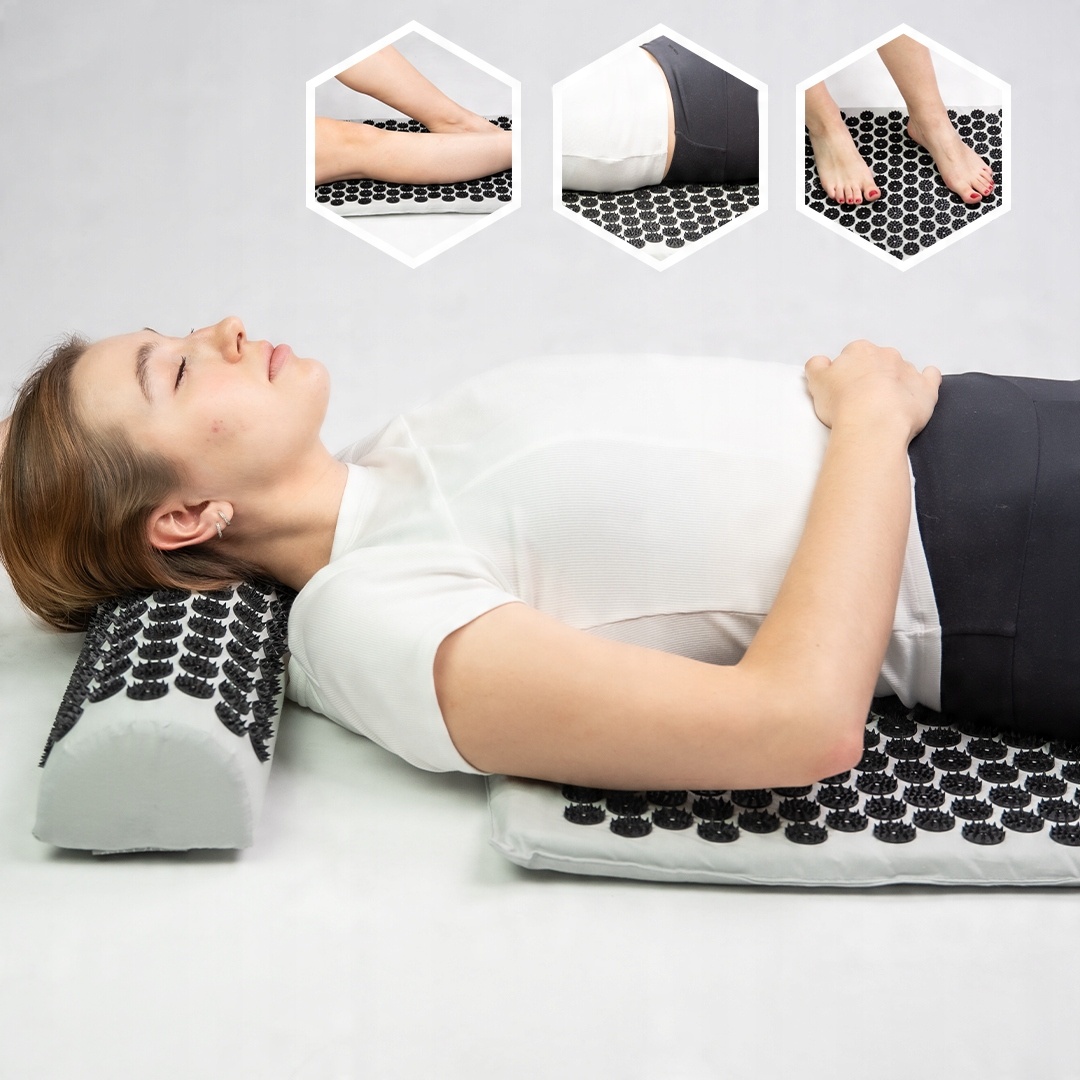 ◼️ Если вы пользуетесь ковриком впервые, для снижения интенсивности давления можно использовать простыню и расстелить ее. шипы или лягте на коврик в футболке. Со временем, когда ваше тело привыкнет к массажу, вы сможете использовать коврик без футболки или простыни.