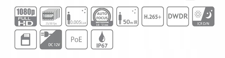 Камера Dahua IPC-HFW1230T-ZS-2812-S5 оснащена 1/3-дюймовым 2-мегапиксельным CMOS-сенсором с прогрессивной разверткой, благодаря которому камера генерирует изображение в максимальном разрешении 1920x1080 пикселей (2Mpx). Для получения более качественной записи в камере предусмотрено множество решений, улучшающих видимость сцены, таких как WDR 120dB, 3DNR.Моторизованный объектив с диапазоном фокусных расстояний от 2,8-12мм предоставляет большие возможности для регулировки зоны обзора.Инфракрасный осветитель с дальностью действия до50м позволяет камеру можно использовать в ночное время. К преимуществам камеры можно отнести встроенный порт для карт памяти microSD (до 256 ГБ) и класс герметичности IP67, позволяющий камере использоваться в сложных климатических условиях.