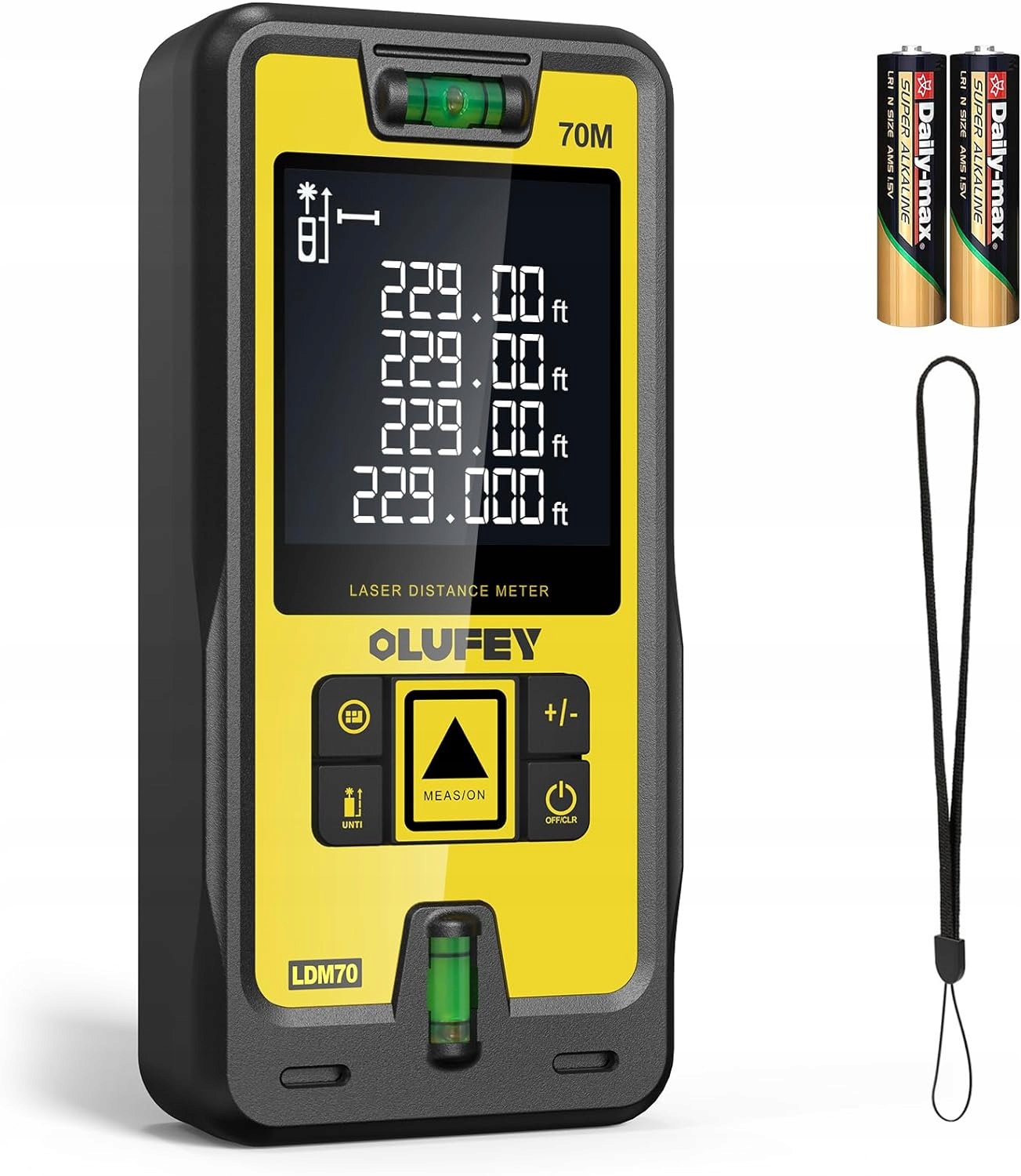 Лазерный дальномер Olufey может измерять расстояния до 70 метров с точностью всего ± 2 мм. Можно переключаться между единицами измерения футы/м/дюймы, что делает его идеальным для точных измерений.