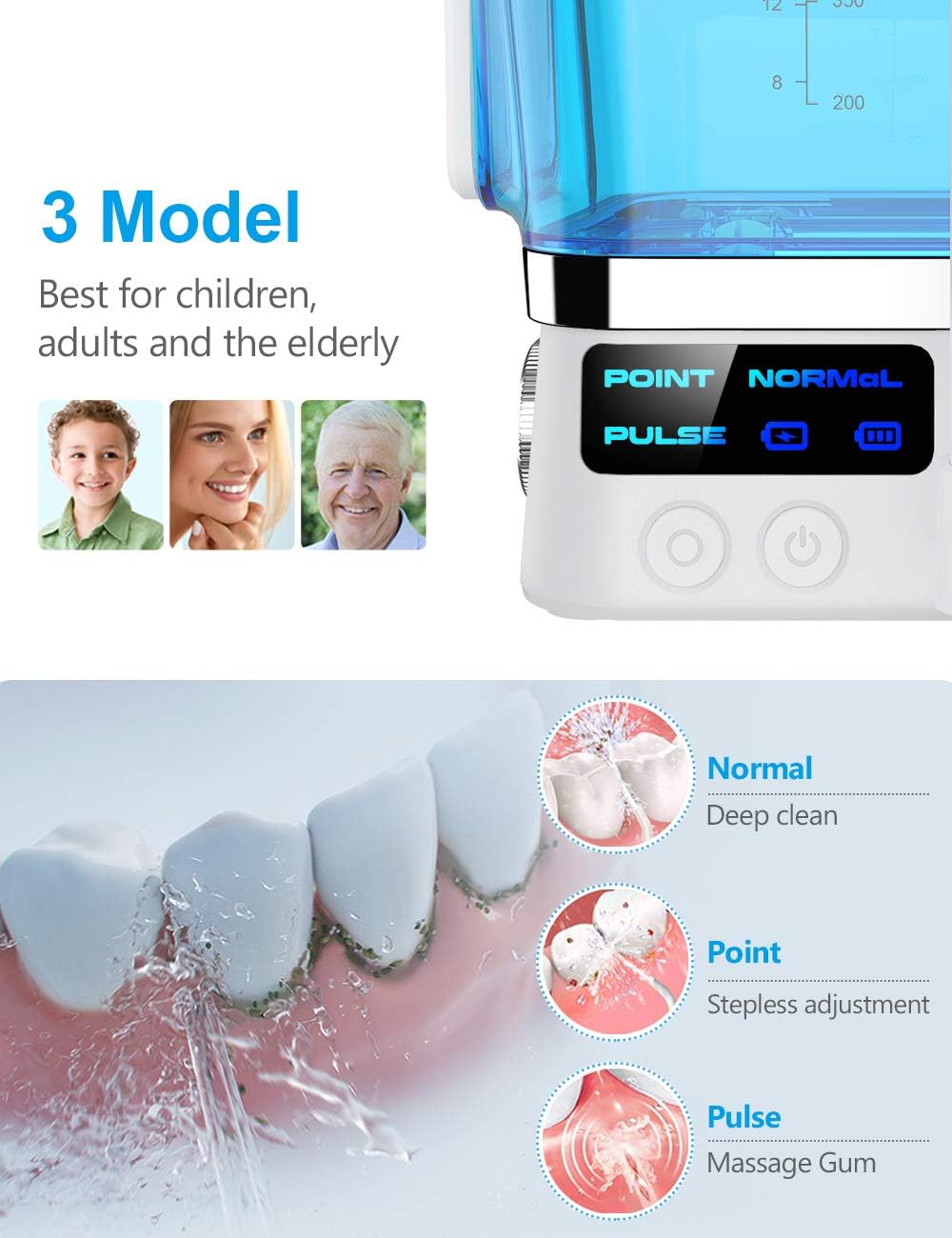 Резервуар для воды на 600 мл и водонепроницаемая конструкция: модернизированный резервуар для воды на 600 мл обеспечивает непрерывную чистку зубной нитью без повторного наполнения водой. Благодаря открытому резервуару и съемной конструкции чистить внутреннюю часть резервуара гораздо проще, чем другие. Конструкция IPX7 для использования в душе и двойные уплотнительные кольца исключают утечку жидкости во время использования.