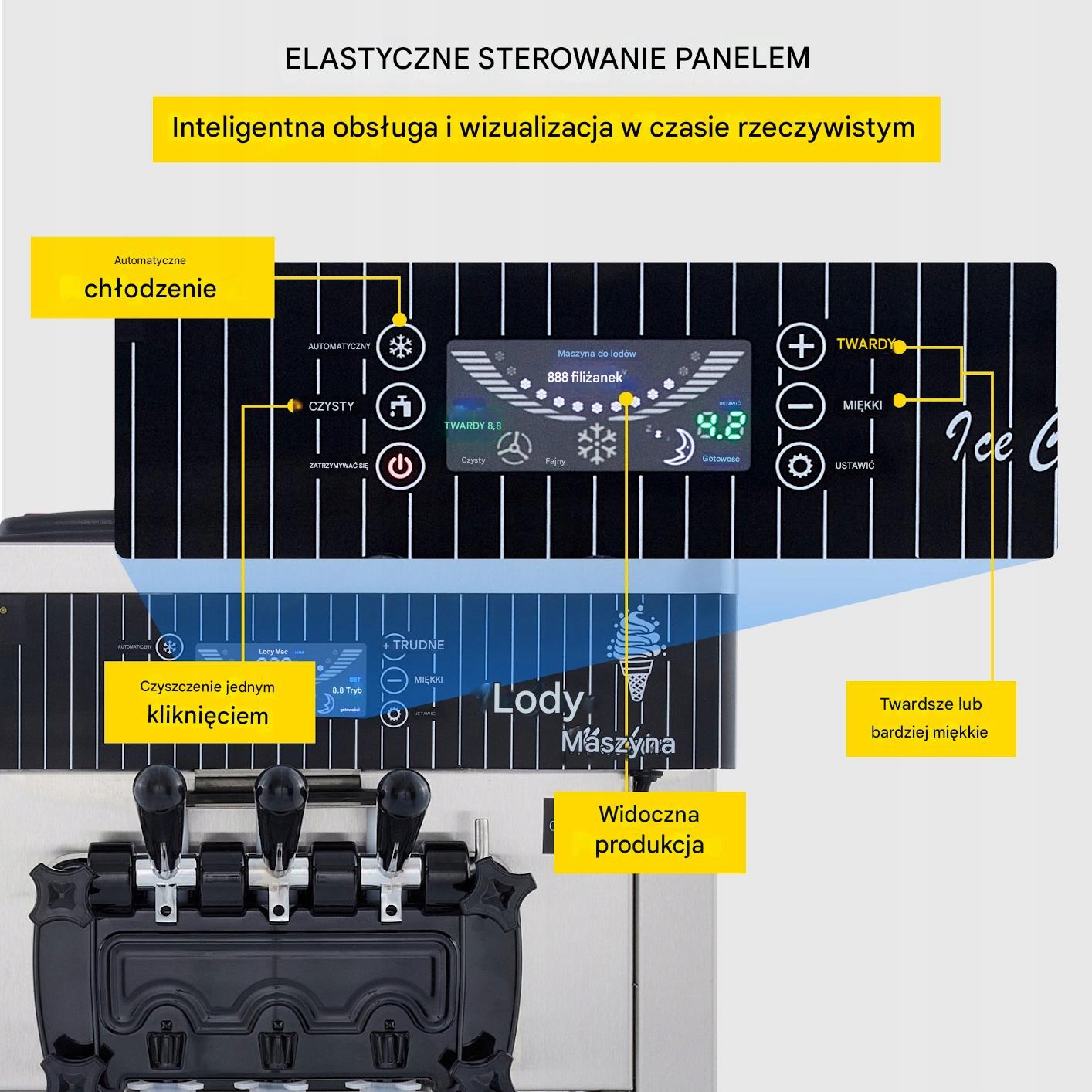 - ✅ Интеллектуальная ЖК -панель: Регулировка твердости, количества и температуры мороженого, самооценка функции.