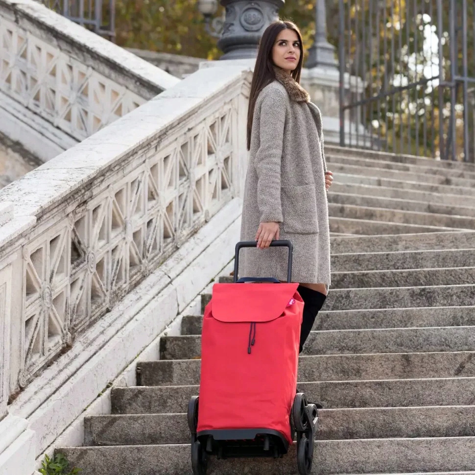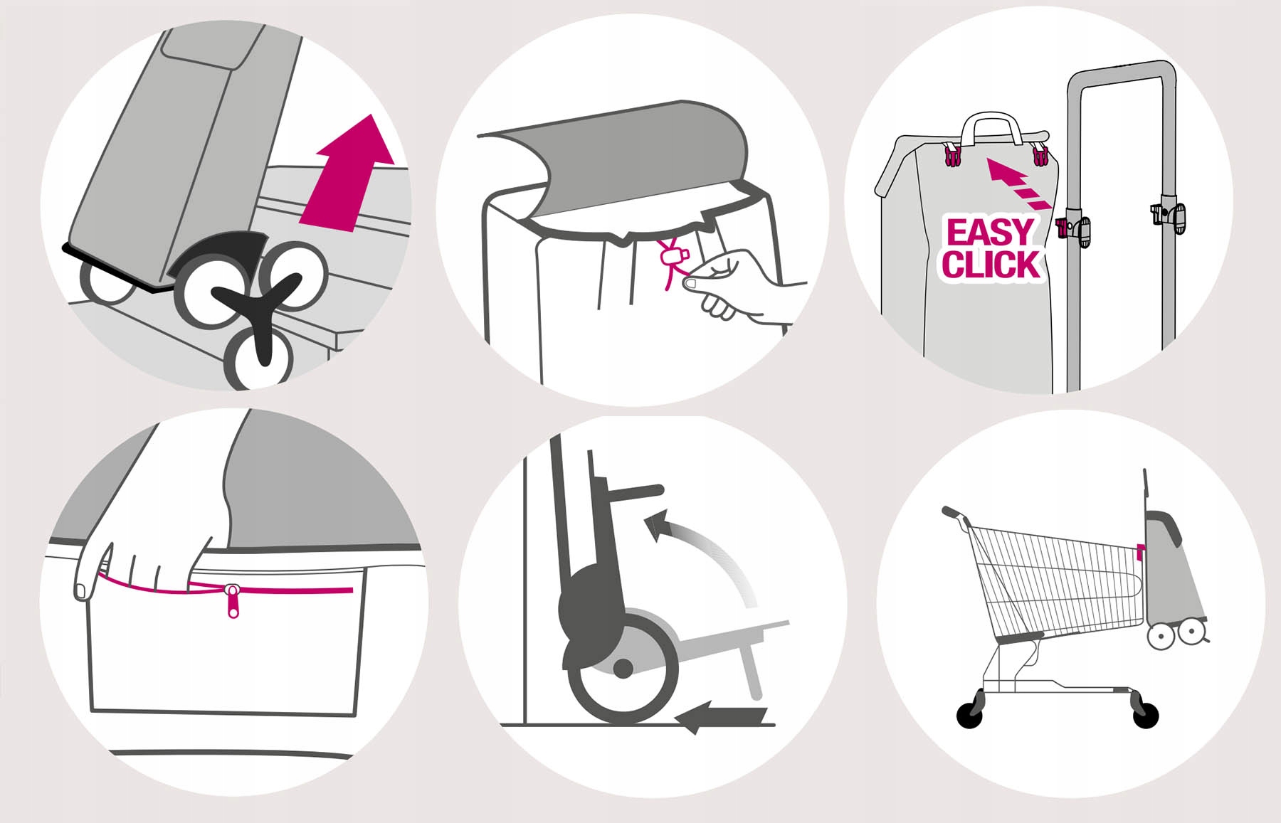 Очень легкая и вместительная сумка для покупок на 6 колесах. Сумка закрывается веревкой и закрывается небольшим клапаном. Коляска имеет специальную систему «Easy-Click» для легкого снятия сумки. Внутри сумки имеется дополнительный карман на молнии. Сумка опирается на пластиковую складную подставку (коляска складывается ровно). Специальная 6-колесная система облегчает подъем покупок по лестнице. Тележку можно повесить на тележку для покупок, поскольку она оснащена специальным крючком.