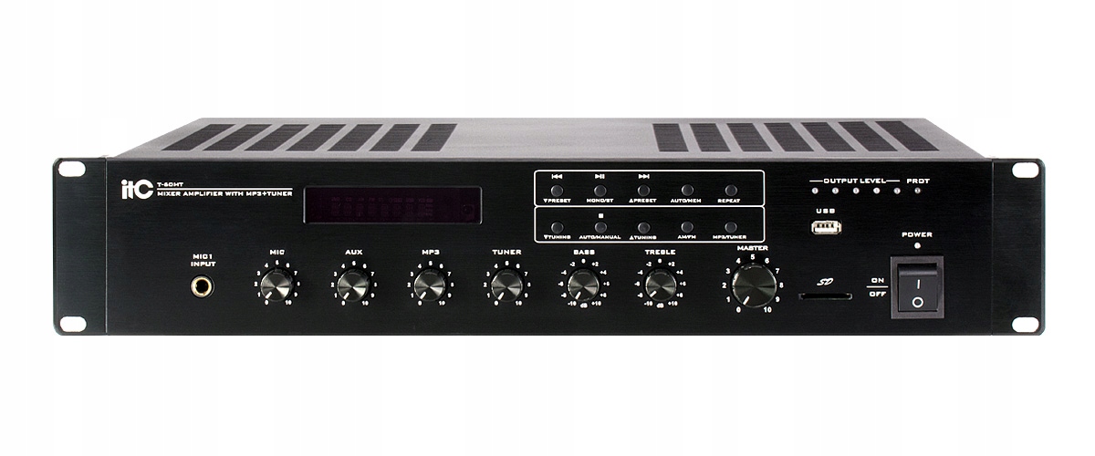 Он оснащен встроенным MP3-плеером с USB входом и гнездом для карты SD, а также AM/FM тюнер с функцией автоматического или ручного сохранения до ста радиостанций. Один микрофонный вход MIC 1 с приоритетом VOX над другими входами (регулируемый уровень отключения звука). У нас также есть возможность подключить микрофон к разъему Jack на передней панели или XLR на задней панели устройства