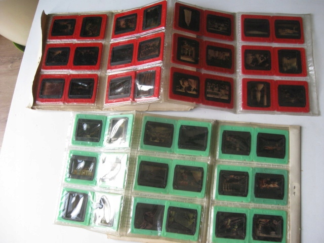 Состояние: слайды очень хорошие (закреплены в фольгированные карманы, следов вынимания из карманов нет), потертые обложки изданий (пыльные складки).