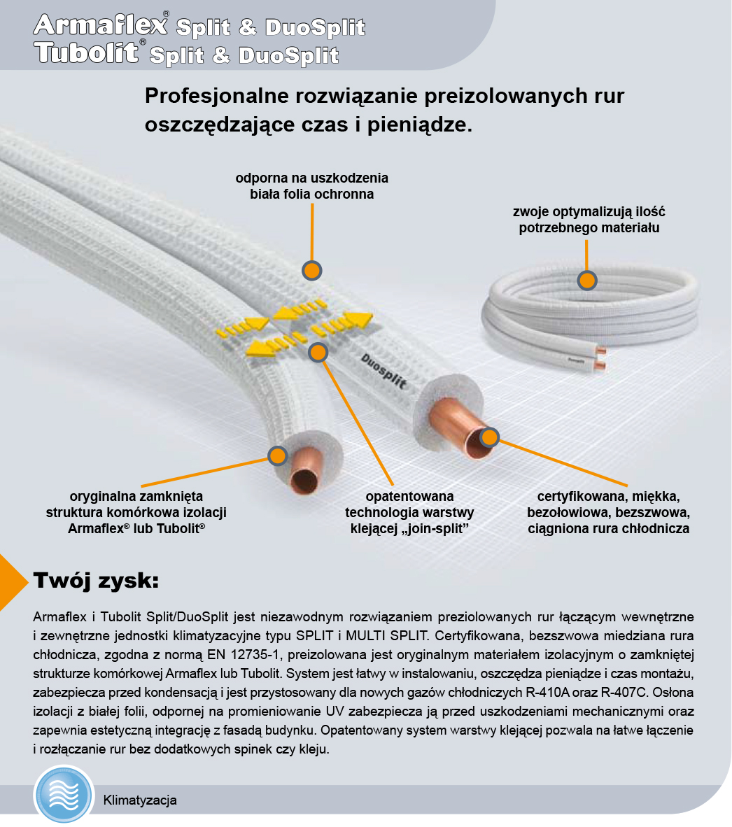 Tubolit Split/ DuoSplit — это надежное решение для изолированных труб, соединяющих внутренние и наружные кондиционеры SPLIT и MULTI SPLIT. Сертифицированная бесшовная медная труба для хладагента, соответствующая стандарту EN 12735-1, с изоляцией из оригинального изоляционного материала Tubolit.