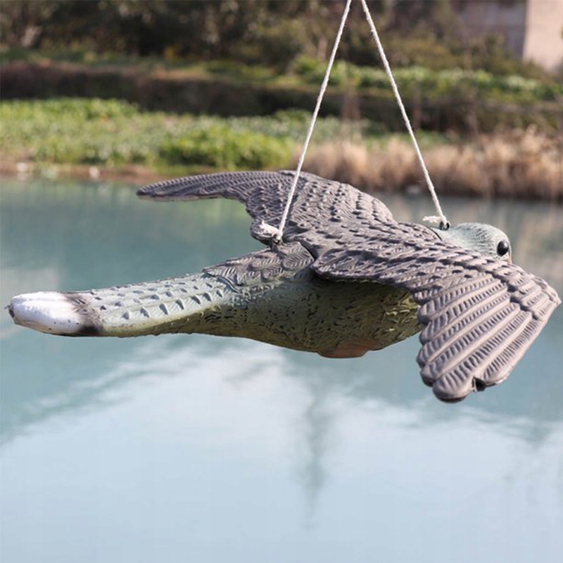 Отпугиватель птиц имеет шнурок с прикрепленным кольцом, благодаря которому манекен можно повесить, например, на дерево. Возможность подвешивания манекена создает впечатление, будто птица летит и движется на ветру, что делает ее более реалистичным убийцей голубей или воробьев. Двигаясь на ветру, фигура оказывает свой эффект. Легкость сборки птицы и возможность подвешивания ее на веревочке позволяет менять расположение птицы.