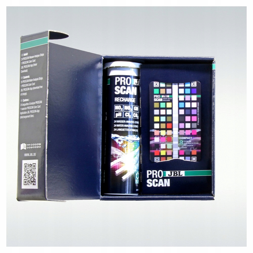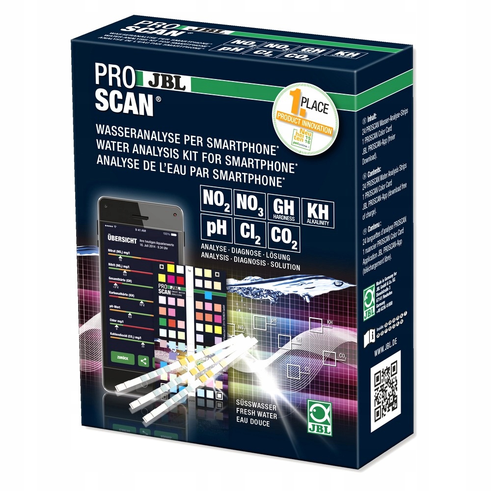 Загрузите бесплатное приложение JBL ProScan, следуйте инструкциям в приложении, погрузите тест-полоски в аквариумную воду, поместите их на цветовую шкалу JBL для анализа, цветовая шкала сканируется, определяются значения, отправляются рекомендации по целевому решению и подсказки.
