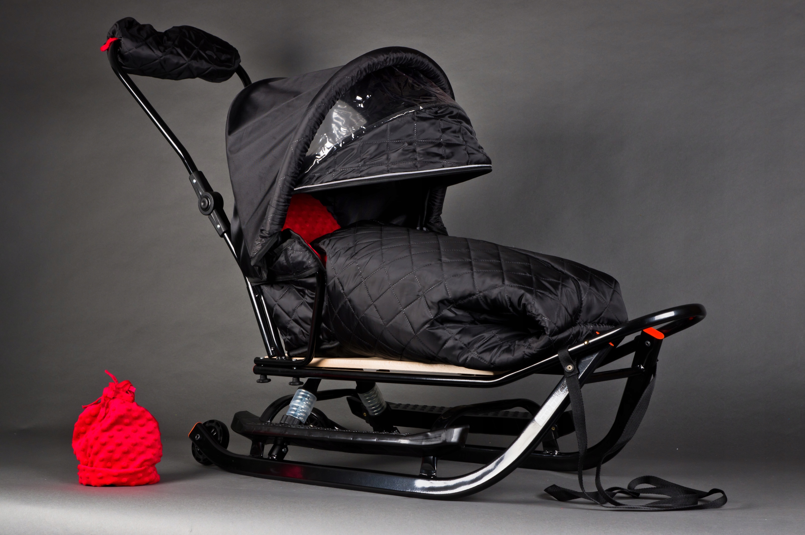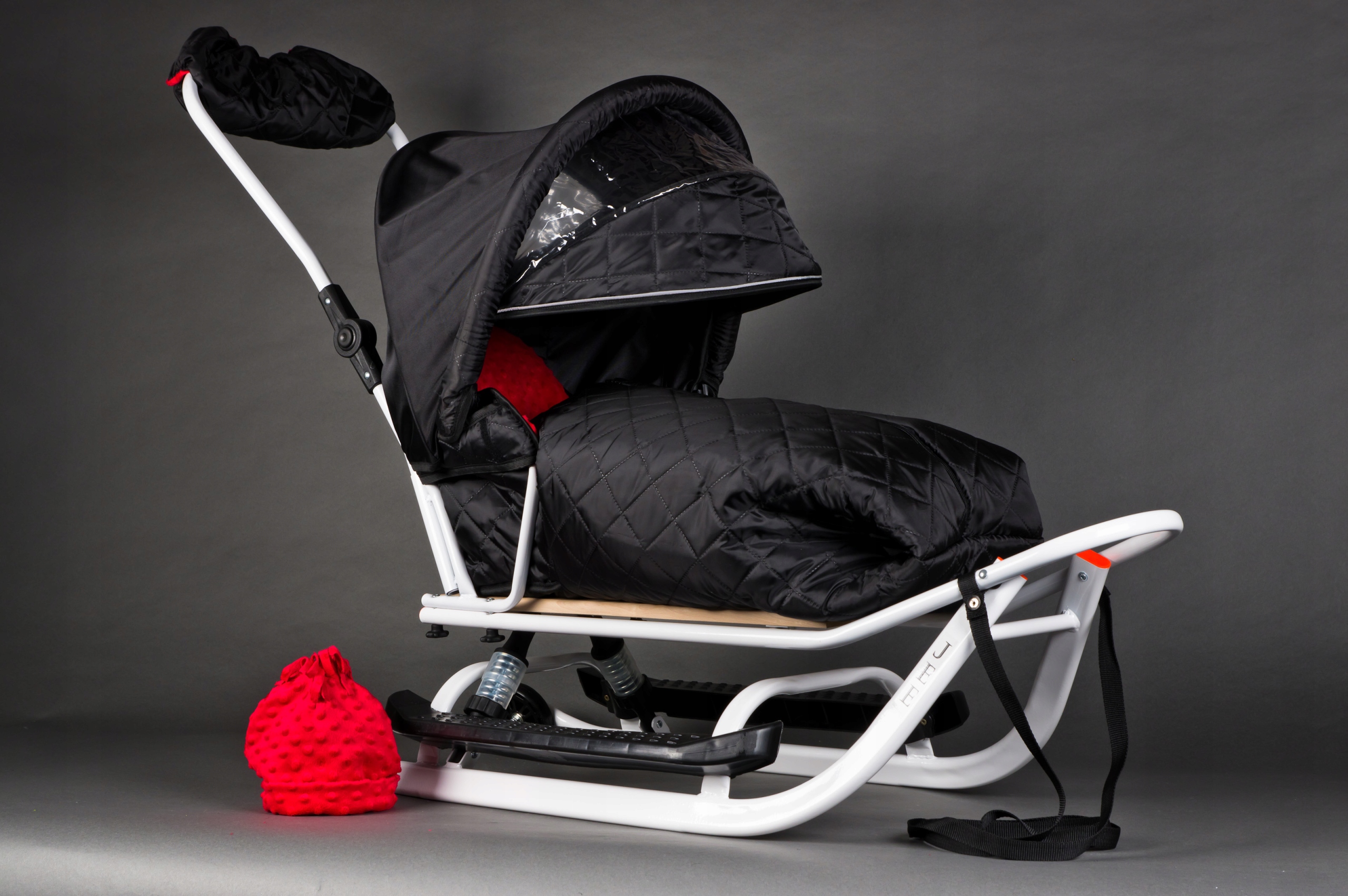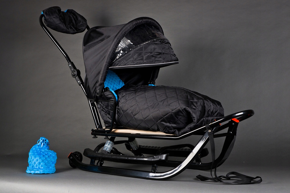 Сани с амортизаторами, спальным мешком, капюшоном, муфтой, шапкой и подножками в версии «все включено».