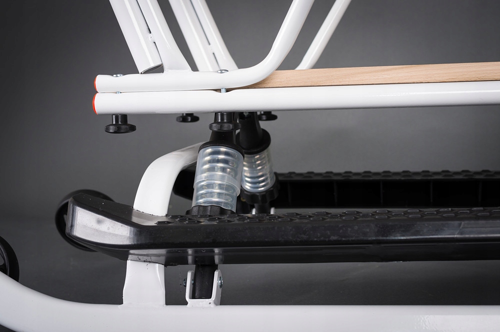 Новинка на рынке – использование в санках амортизаторов, которые делают путешествие приятнее для самых маленьких. дети во время прогулок. Амортизаторы имеют регулировку жесткости: - спортивная функция (сиденье более жесткое) - функция комфорта (сиденье подвержено неровностям)