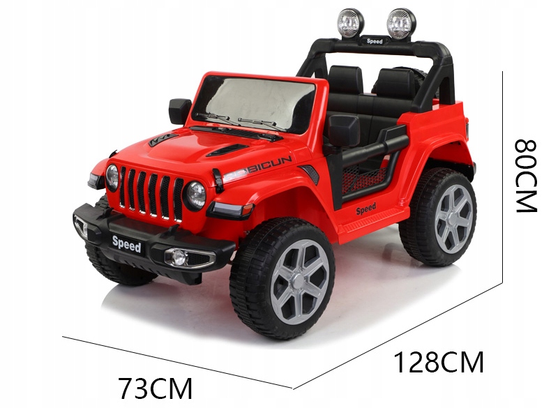 Автомобиль JEEP на аккумуляторе. В автомобиле имеются двери, которые открываются в обе стороны. Он приводится в движение ЧЕТЫРЕ мощными электродвигателями, питаемыми от аккумулятора напряжением 12 В. Автомобиль оснащен звуковыми эффектами, активируемыми кнопками, входом для MP3-плеера, регулятором громкости и светодиодными фонарями. Доступны 3 скорости движения (с функцией дистанционного управления), как вперед, так и назад. Безопасные уроки вождения проводятся с помощью прилагаемого пульта дистанционного управления, который дает родителю полный контроль над автомобилем.