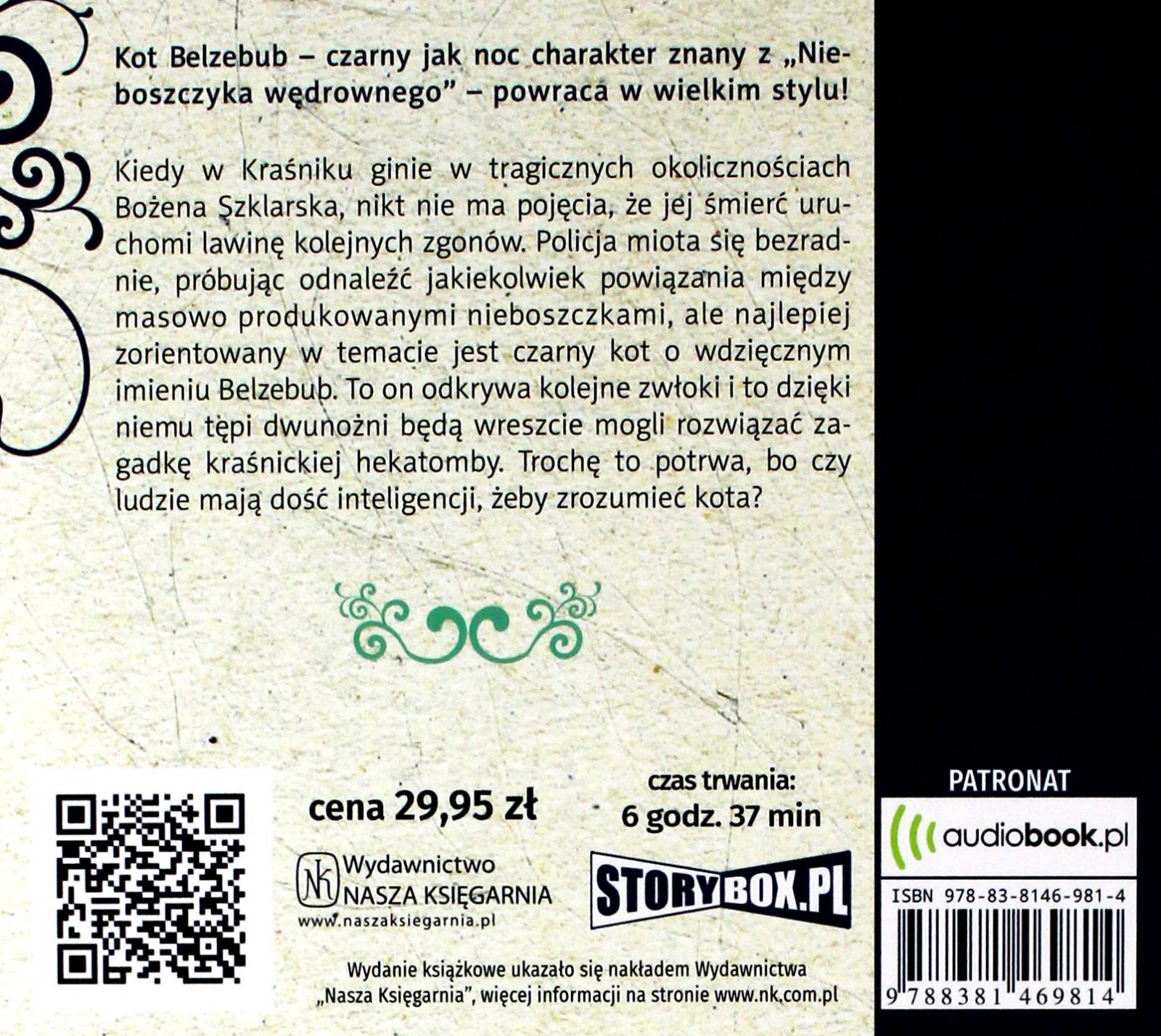Кот Вельзевул — черный как ночь персонаж, известный из «Мертвого странника» — возвращается с размахом! Когда Божена Шклярска умирает при трагических обстоятельствах в Краснике, никто даже не подозревает, что ее смерть вызовет лавину новых смертей. Полиция беспомощно пытается найти какую-либо связь между трупами, изготовленными серийно, но лучшим знатоком по этому вопросу является черный кот с метким именем Вельзевул. Именно он обнаруживает еще один труп, и благодаря ему тупые двуногие наконец смогут разгадать тайну гекатомбы Красника. Это займет некоторое время, ведь хватит ли у людей интеллекта, чтобы понять кошку? «Рука с сердитыми розовыми ногтями, торчащая из крапивы. Марылка какое-то время бессмысленно смотрела на нее, пока, наконец, в ее сознании не возникла череда ассоциаций. Неподвижная женская рука, жгучая крапива, Вельзевул, с явной гордостью смотрящий на находку. Блин, бывало и раньше с ней такое случалось! Только вместо чопорной барыни главную роль играла чопорная курганка, а вместо луговых сорняков были домашние папоротники! , Вельзевул, доведший ее до трупа»
