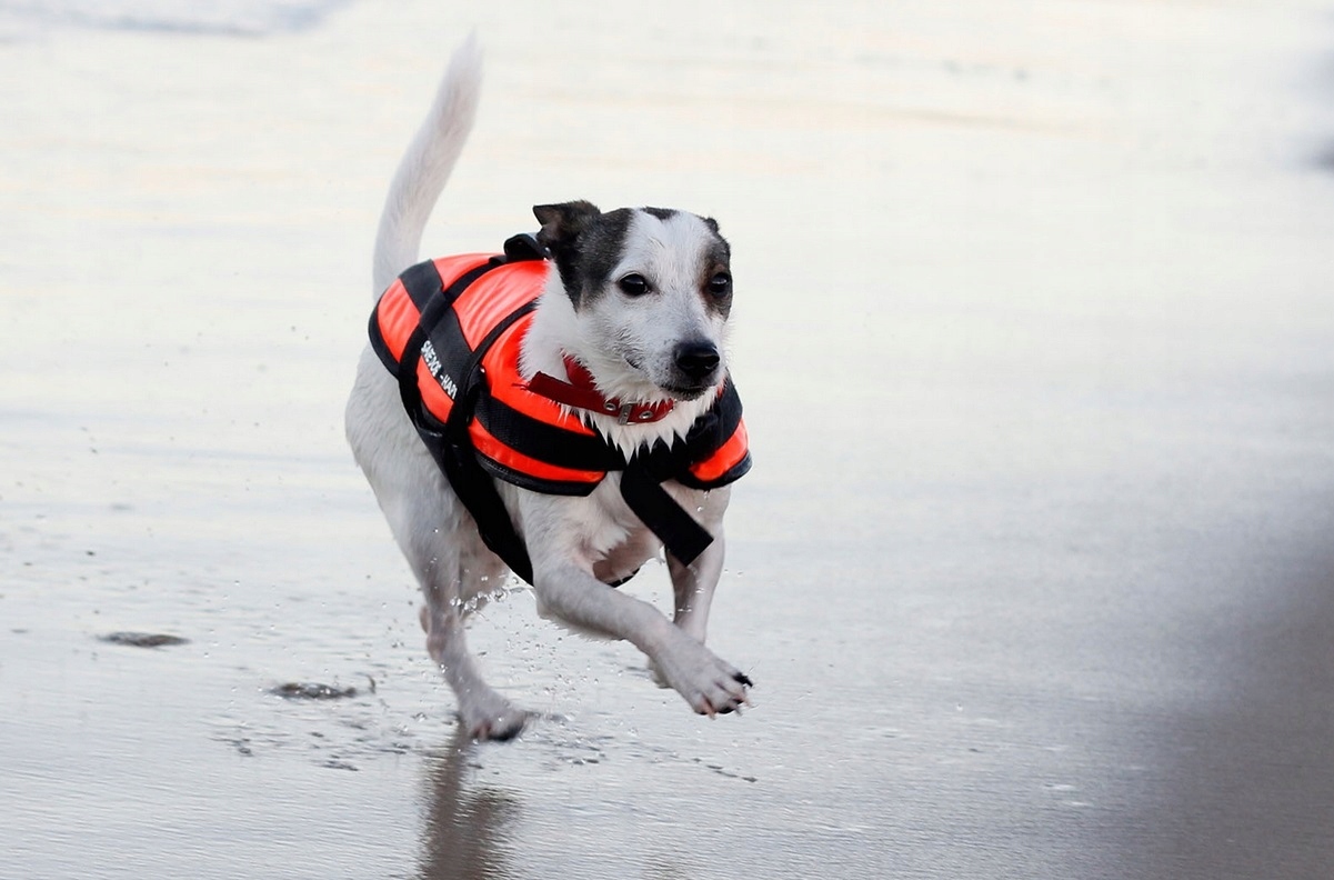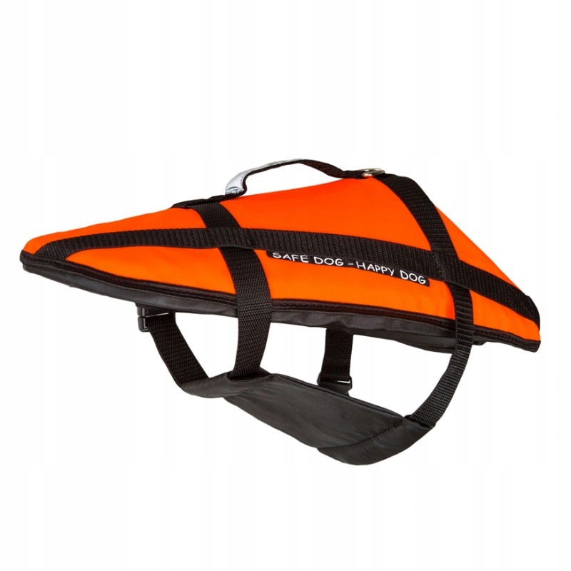 Жилет заполнен легкой пеной, держащей собаку на поверхности, помогая ему течь. Кроме того, это также защищает от холода. Жилет имеет два брюшных ремня и фланцевый крепеж, при котором кольцо прикреплено к креплению поводка.