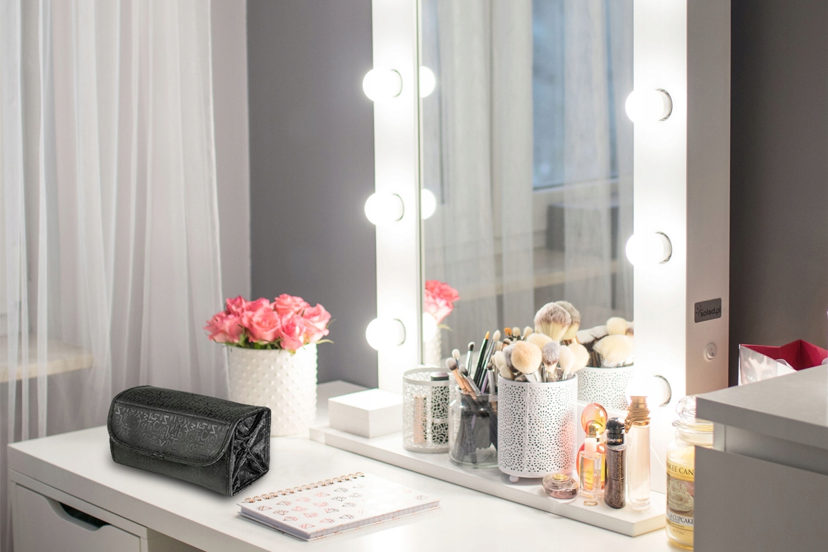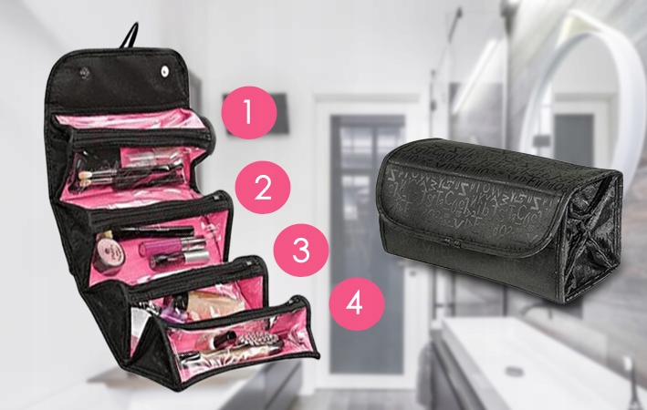 - Чрезвычайно практична — она свернута, поэтому ее можно полностью сложить, и она гораздо легче поместится, например, в ручную кладь или женскую сумочку, а при необходимости сразу развернется и обеспечивают быстрый доступ ко всей необходимой косметике.