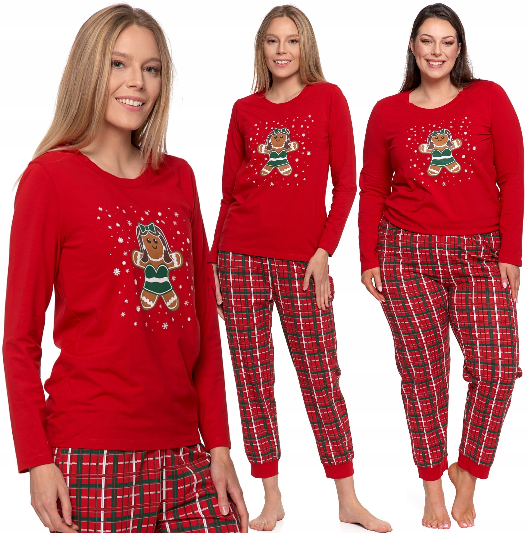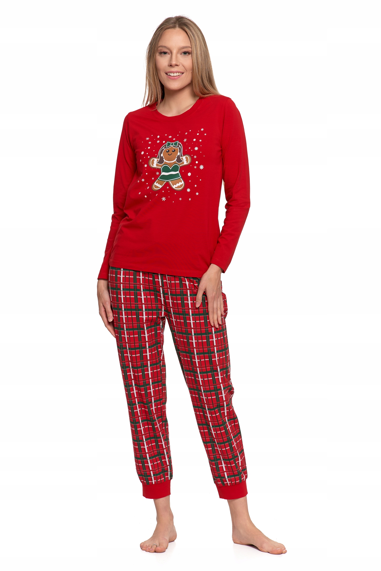 Почувствуйте атмосферу Рождества с очаровательной женской пижамой с пряничным принтом! Топ насыщенного красного цвета с длинными рукавами и забавным рождественским принтом идеально впишется в атмосферу зимних вечеров. Брюки в классическую красную клетку с зелеными и белыми акцентами, дополненные мягкими манжетами, придают образу характер и комфорт.
