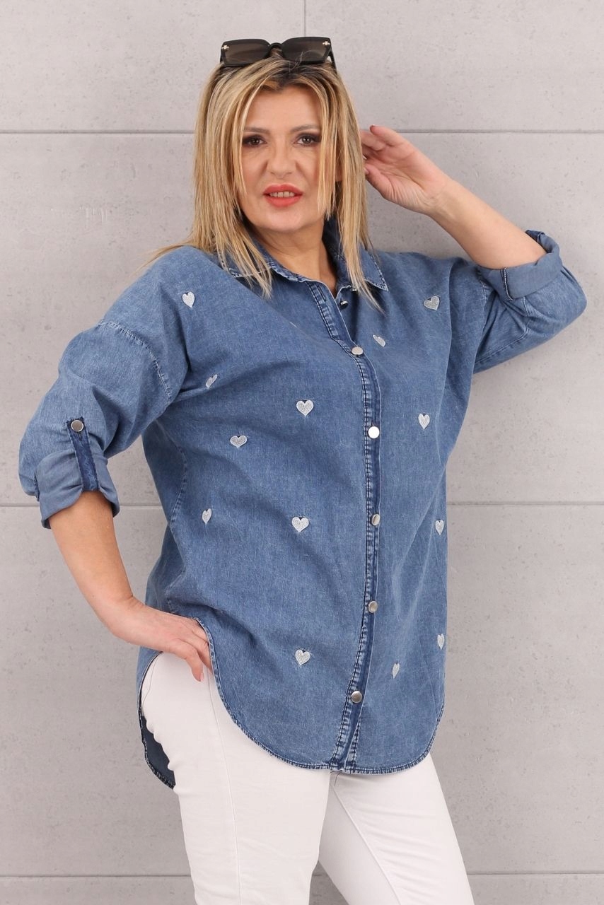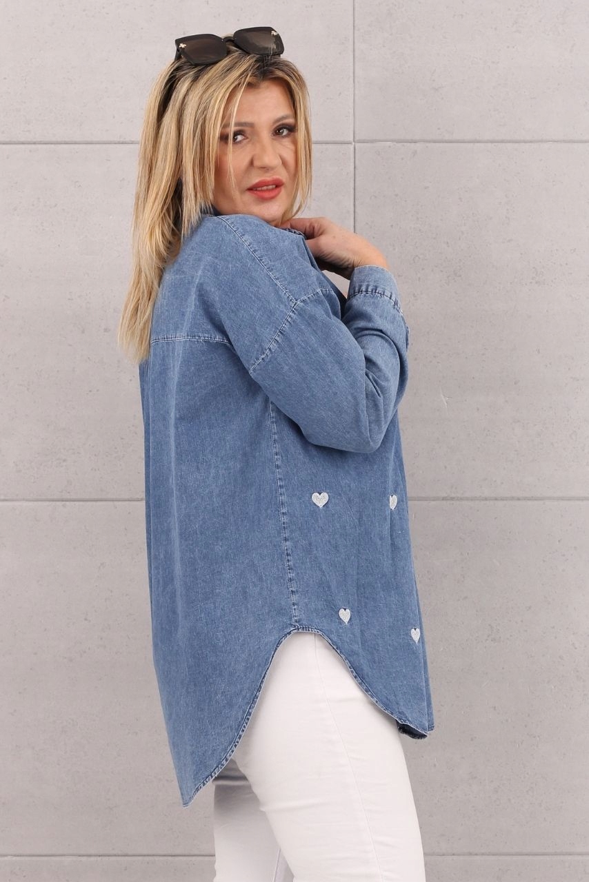Женская рубашка выполнена из нежного денима с тонкой фактурой, что придает ей легкость и утонченность. Передняя часть украшена очаровательной вышивкой в виде сердечек, что придает ей неповторимый шарм. Рубашка имеет универсальное применение: ее можно носить отдельно или как накидку, например, поверх верхней одежды, что дает множество возможностей для создания разнообразных стилей и позволяет создавать разнообразные и модные комплекты.