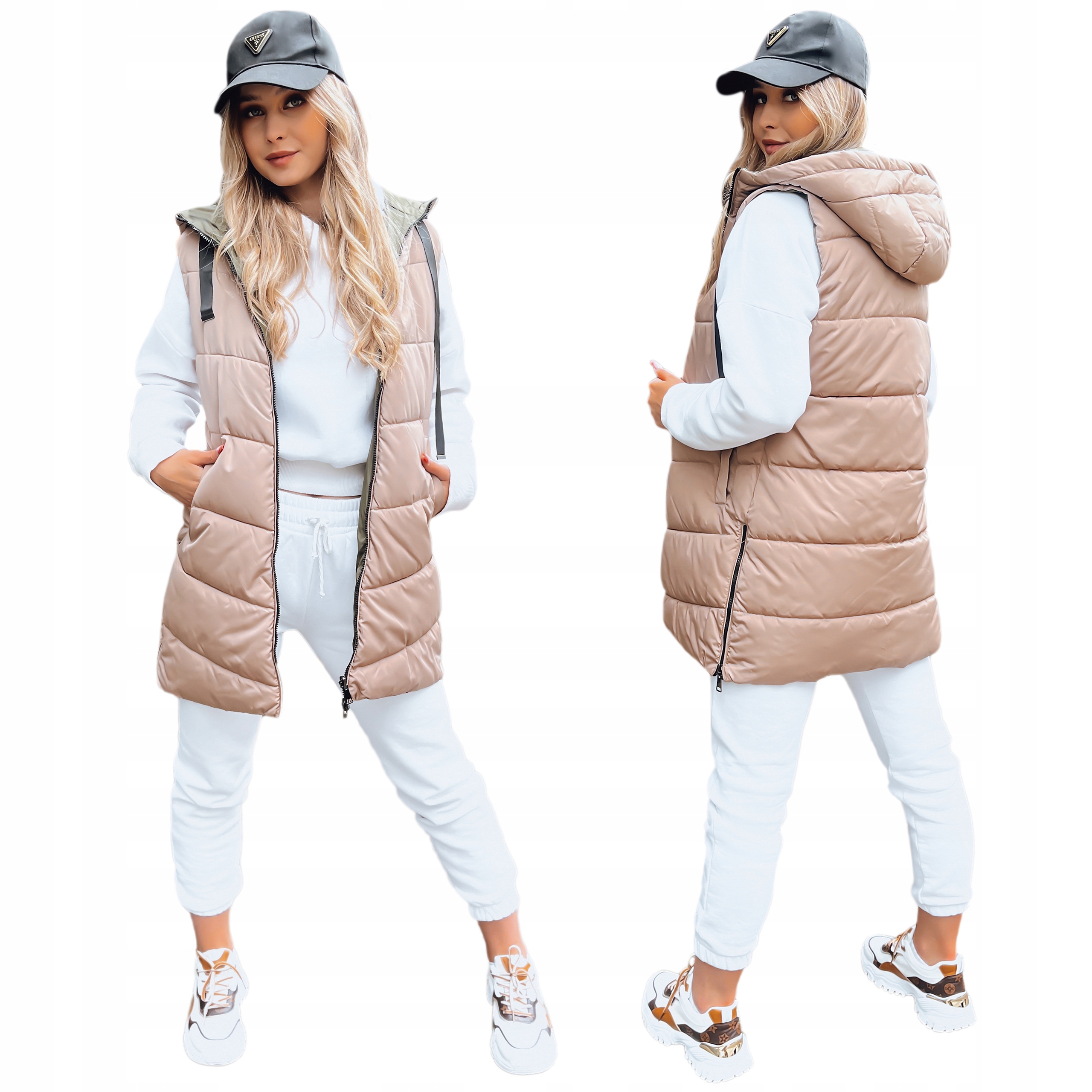 Удлиненный жилет. Модель имеет молнии по бокам. Капюшон несъемный, что придает ему спортивный вид. Спереди есть два вместительных кармана. Жилет двусторонний. Доступен в нескольких цветовых вариантах.