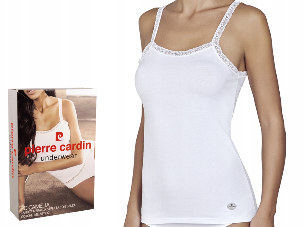 Женская T -мала из высококачественного хлопка на узких ремнях. Ремешок и вырез, украшенные нежной кружевной лентой с цветочным мотивом. Нижняя часть T -Fore, украшенная глянцевой логотипом компании.
