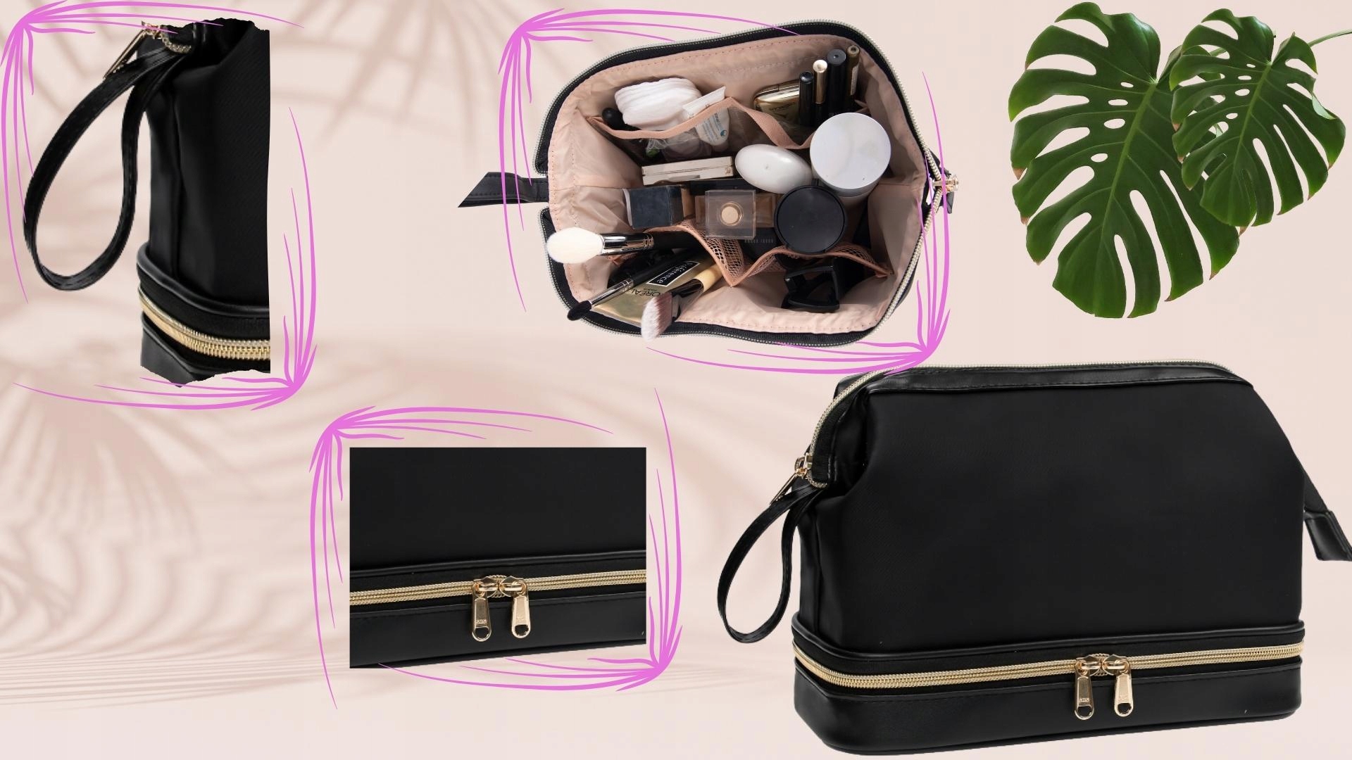 - ✅Элегант - качественный материал, верхняя часть косметички изготовлена из легко чистящегося нейлона, а нижняя часть - из экологической кожи. Качественные молнии золотистого цвета добавляют элегантности косметичке.