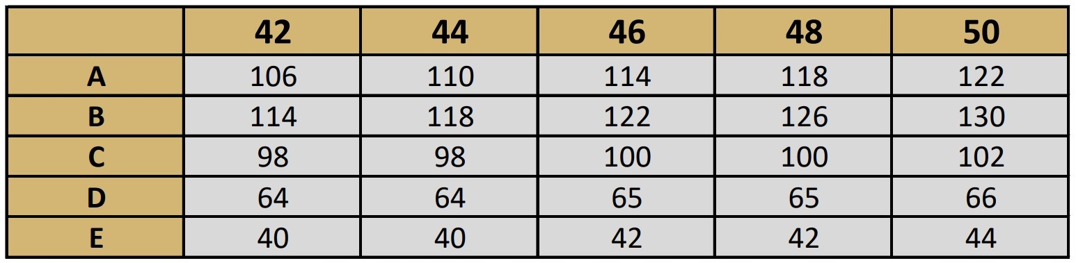 РАЗМЕРНАЯ ТАБЛИЦА - РАЗМЕРЫ НА ПЛОСКОЙ ПЛОСКОСТИ: