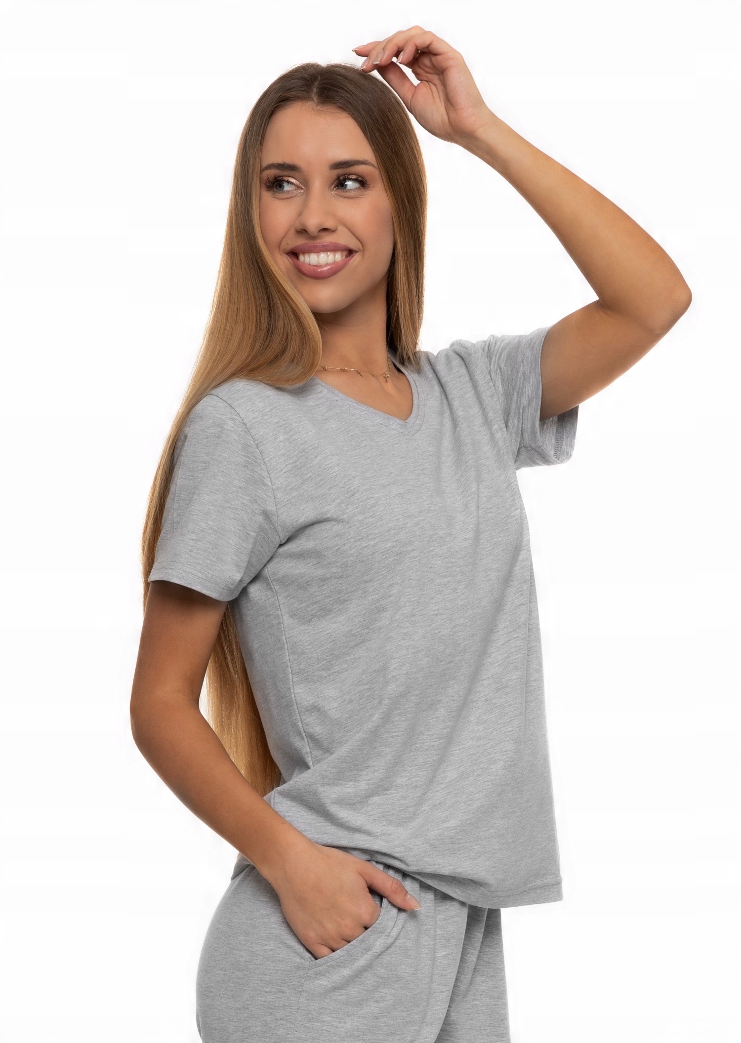 Серая женская пижама с футболкой с V-образным вырезом и длинными брюками на резинке – предложение для женщин, которые ценят комфорт и стиль. Изготовленный из мягкого, нежного материала, он гарантирует комфорт и свободу движений в течение всей ночи. Футболка с V-образным вырезом красиво подчеркивает шею и добавляет легкости всему комплекту. Длинные брюки на резинке обеспечивают идеальную посадку по фигуре и при этом не сковывают движений. Серые цвета пижам делают их вневременными и легко сочетаемыми с другими предметами гардероба. Эта пижама станет идеальным выбором для прохладных вечеров, когда хочется чувствовать себя комфортно и уютно. Исключительное качество изготовления гарантирует долгосрочное использование и простоту ухода. Серая женская пижама с футболкой с V-образным вырезом и длинными брюками на резинке – это сочетание комфорта и стиля, которое удовлетворит даже самых требовательных женщин.