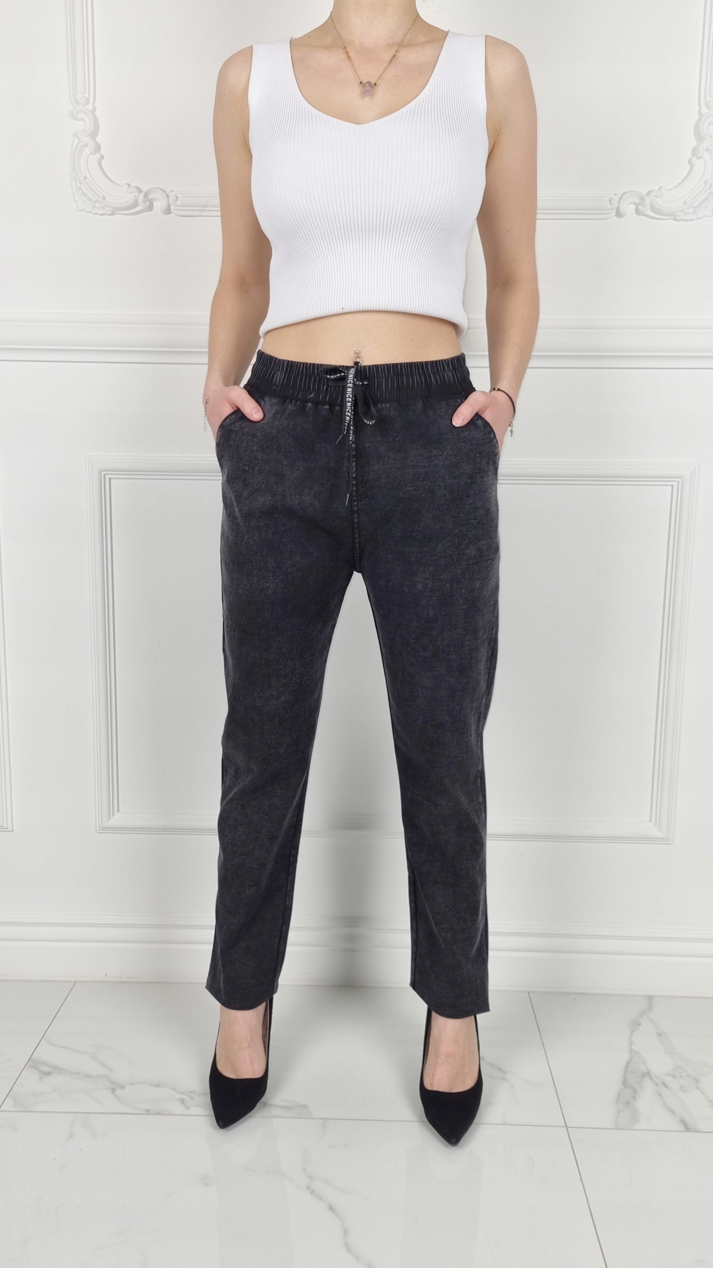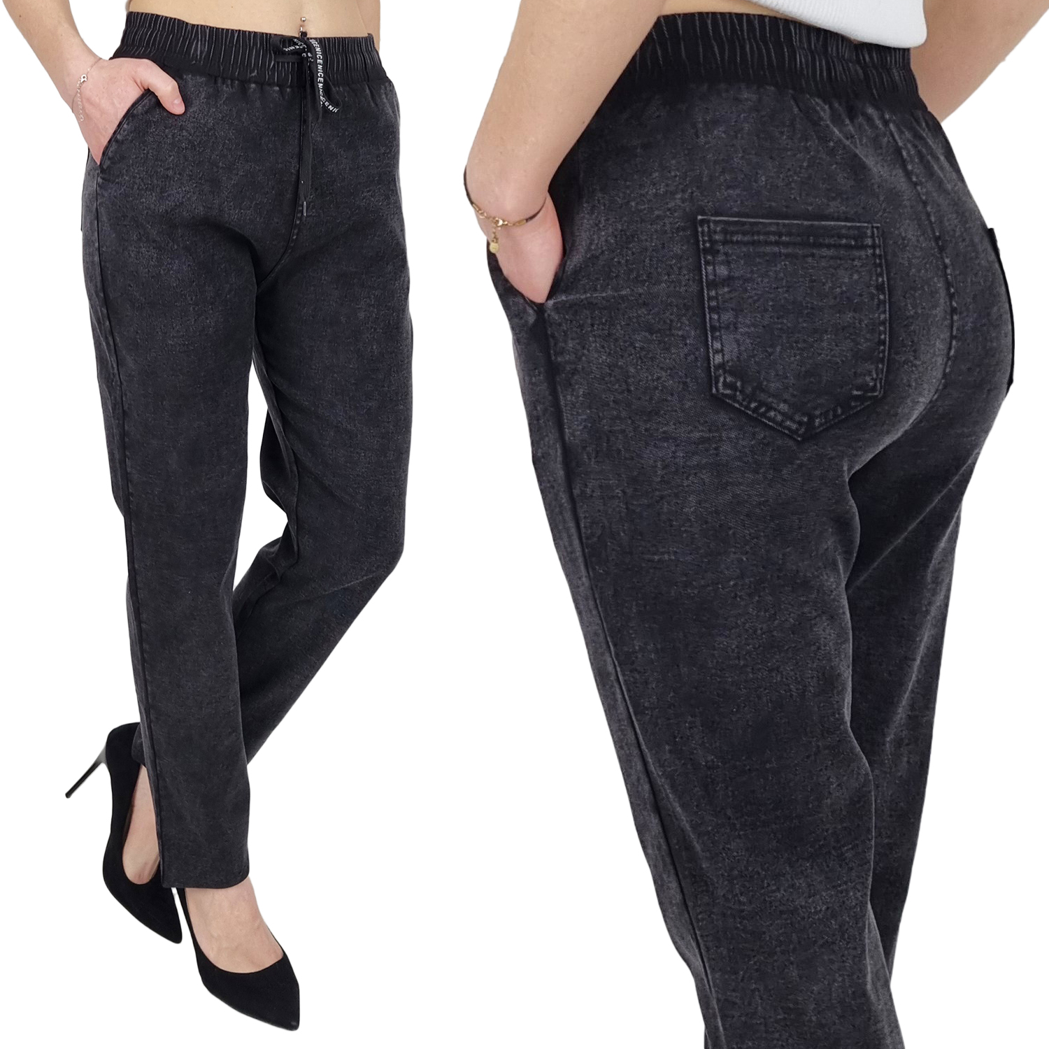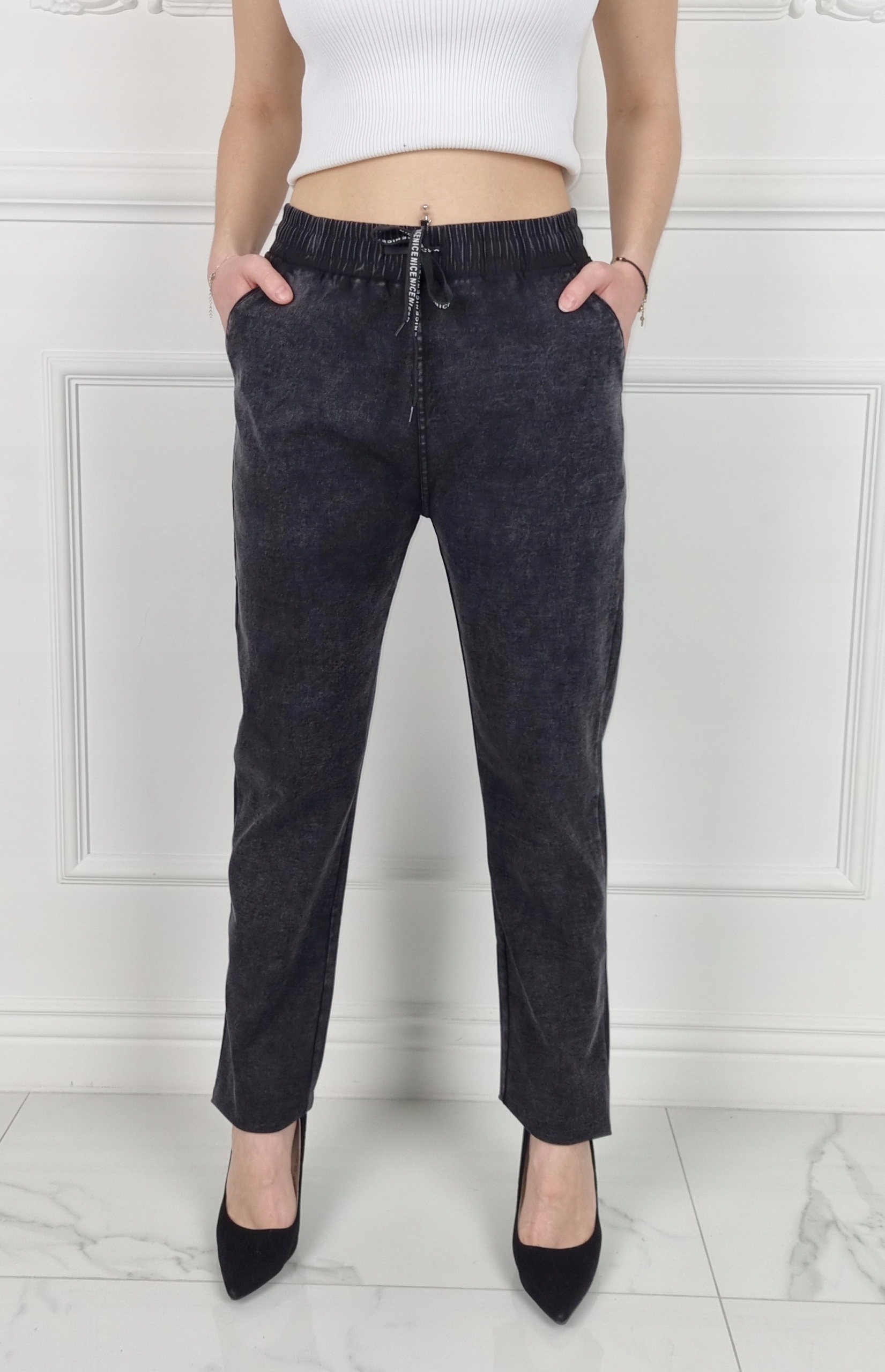 Отличные джинсовые брюки с высокой талией, резинкой и завязкой. Отлично подходят для спортивной обуви, но подойдут также прекрасно сочетаются с обувью на высоком каблуке, благодаря своей универсальности подходят практически к любому стилю. Брюки свободного кроя, эластичные. Сделайте свой повседневный образ уникальным. Брюки имеют карманы с обеих сторон.