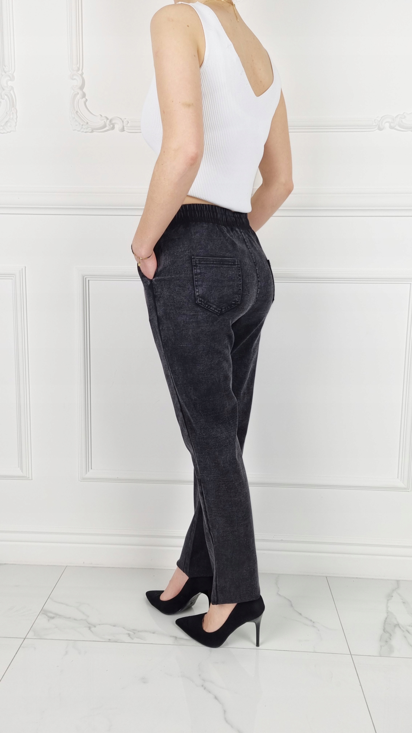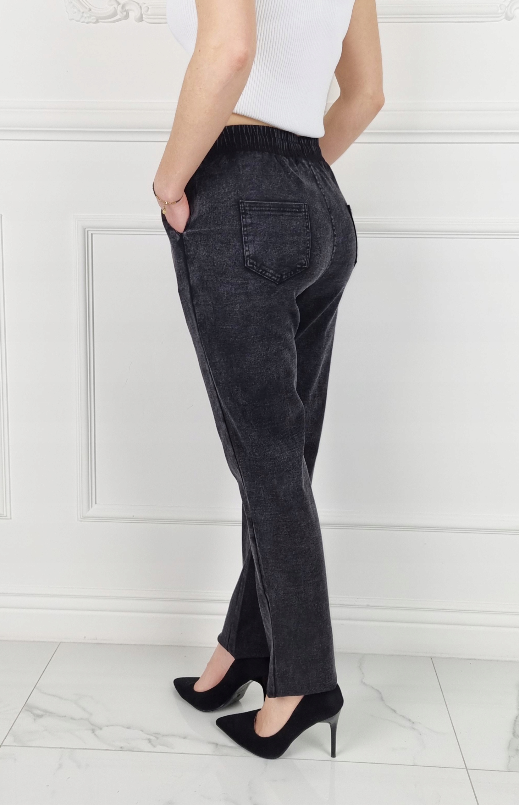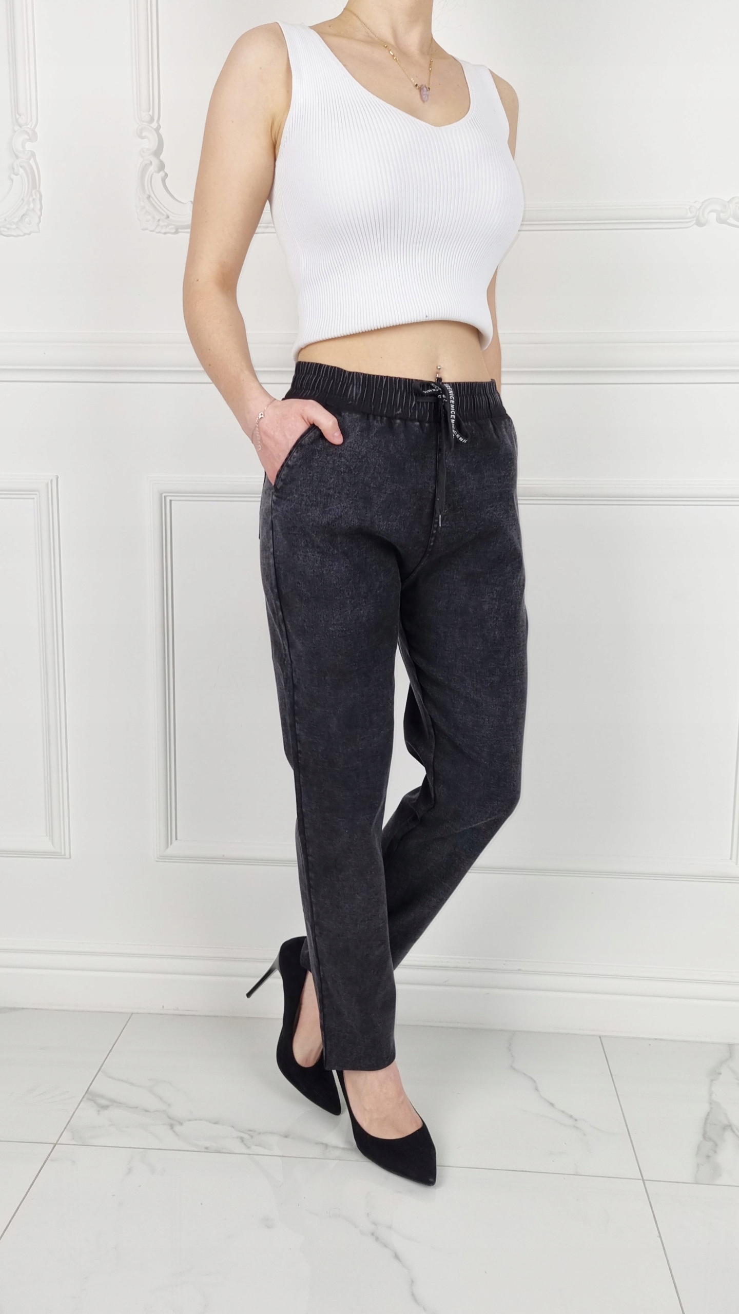 Отличные джинсовые брюки с высокой талией, резинкой и завязкой. Отлично подходят для спортивной обуви, но подойдут также прекрасно сочетаются с обувью на высоком каблуке, благодаря своей универсальности подходят практически к любому стилю. Брюки свободного кроя, эластичные. Сделайте свой повседневный образ уникальным. Брюки имеют карманы с обеих сторон.